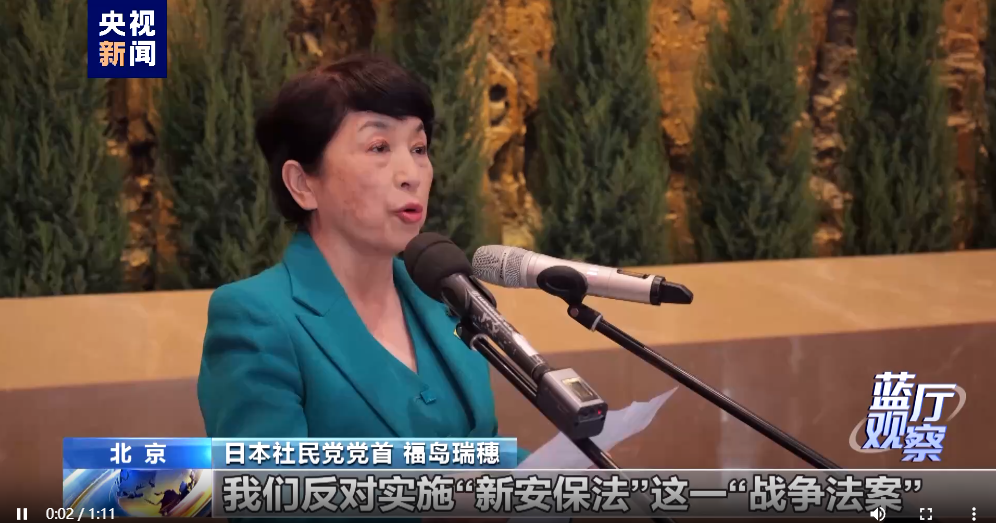 日本社会民主党党首福岛瑞穗。(图/中国央视新闻视频截图)