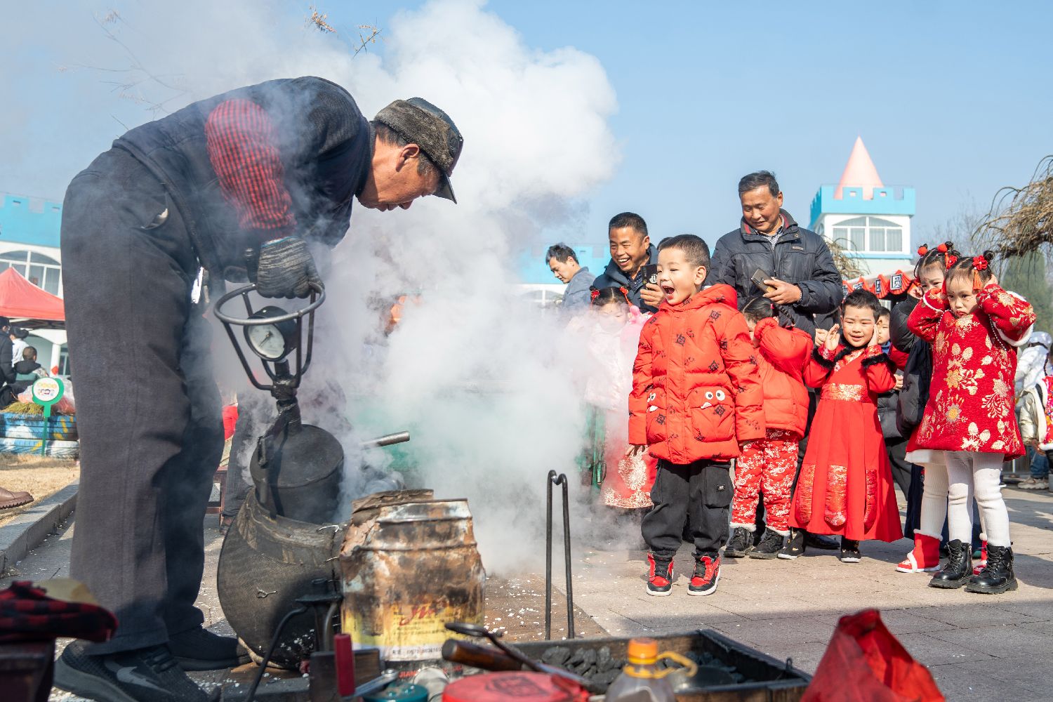 1月11日,小朋友们在庙会上看爆米花。(中新社)