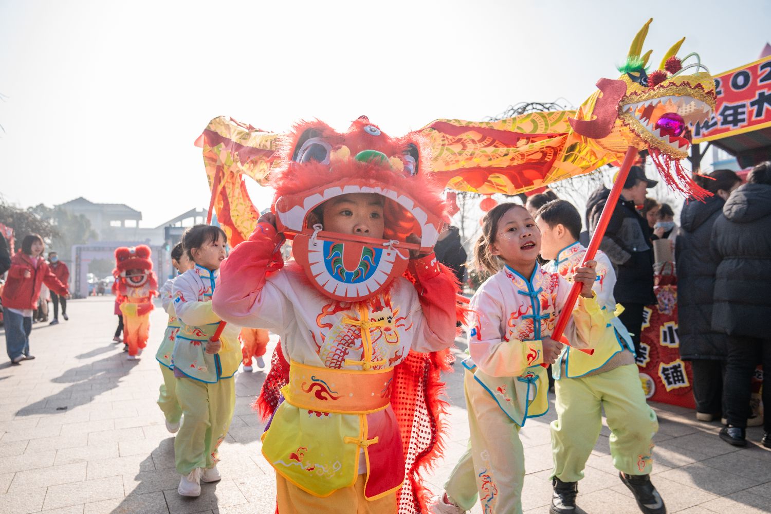 1月11日,浙江省湖州市长兴县煤山镇中心幼儿园内,小朋友们正在看表演、逛庙会。当日,煤山镇中心幼儿园举办“赏民俗 过大年”民俗文化集市活动,为小朋友搭建了一个逛庙会、赶大集的年文化平台,让小朋友们近距离感受到投壶、舞龙狮、写对联等中国传统年味的浓厚传统文化魅力。图为1月11日,小朋友们在庙会上进行舞龙表演。(中新社)