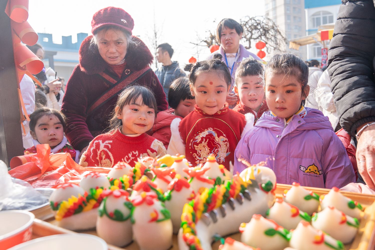 1月11日,小朋友们在庙会上看花馍。(中新社)