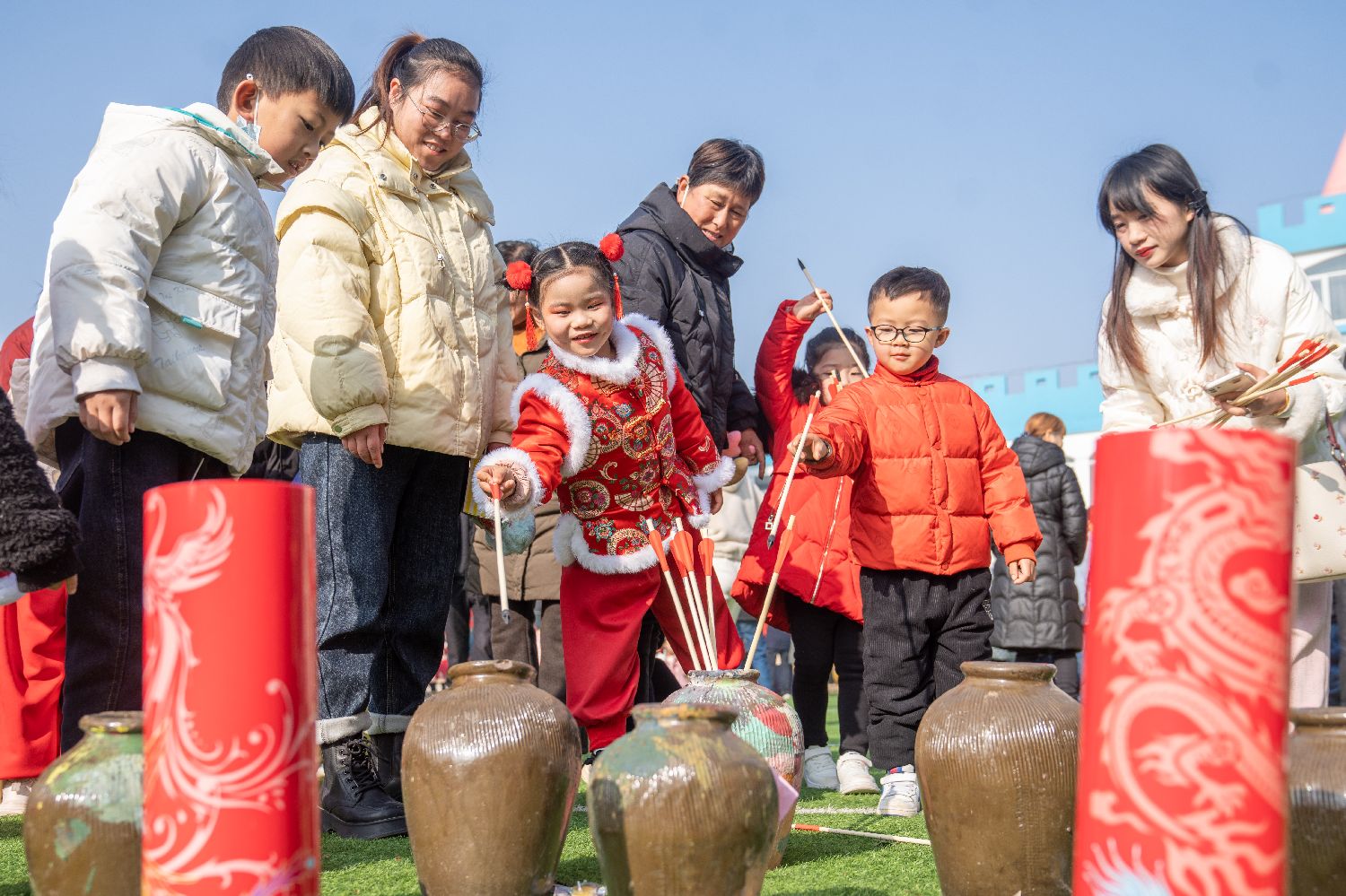 1月11日,小朋友们在庙会上进行投壶游戏。(中新社)