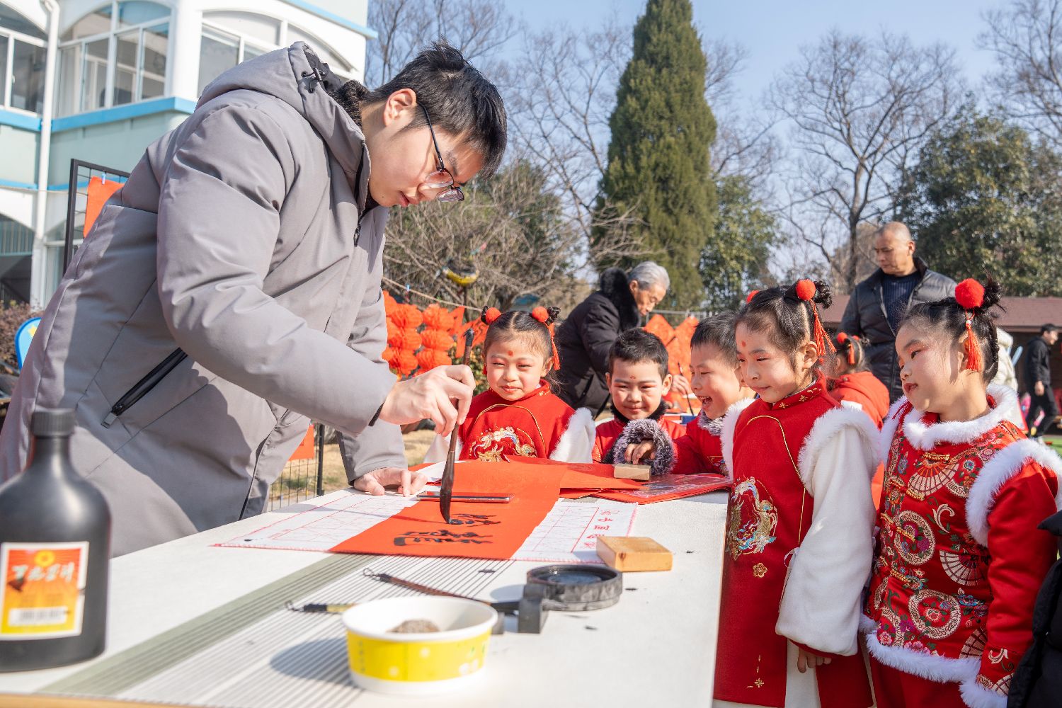 浙江省湖州市长兴县煤山镇中心幼儿园1月11日举办“赏民俗 过大年”民俗文化集市活动,为小朋友搭建了一个逛庙会、赶大集的年文化平台,让小朋友们近距离感受到投壶、舞龙狮、写对联等中国传统年味的浓厚传统文化魅力。