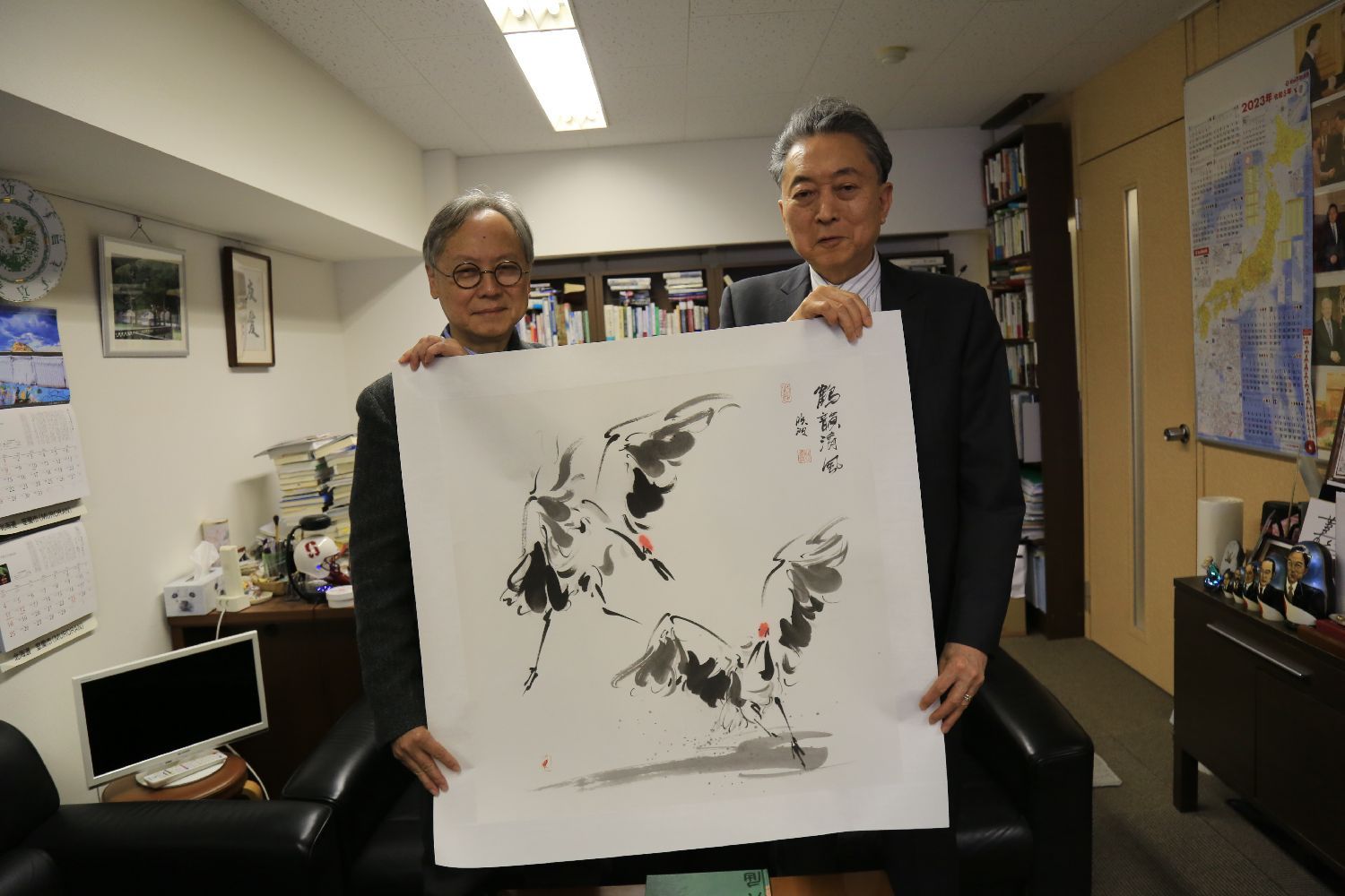 当天,鲁晓波还拜访了日本前首相鸠山由纪夫,并赠送了自己创作的《鹤韵清风》图。鸠山先生热情接待了鲁晓波,并与他探讨起了中日两国不同的“鹤”文化。鸠山由纪夫一直秉持友爱与和平的理念,他也希望,通过鲁晓波先生的展览,不断推动中日民间的友好交流。