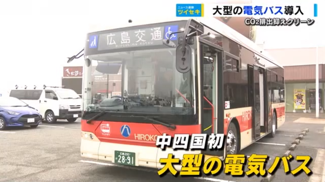 广岛交通巴士公司的一辆新型电动巴士于22日上午投入运营。(图/新广岛电视台视频截图)