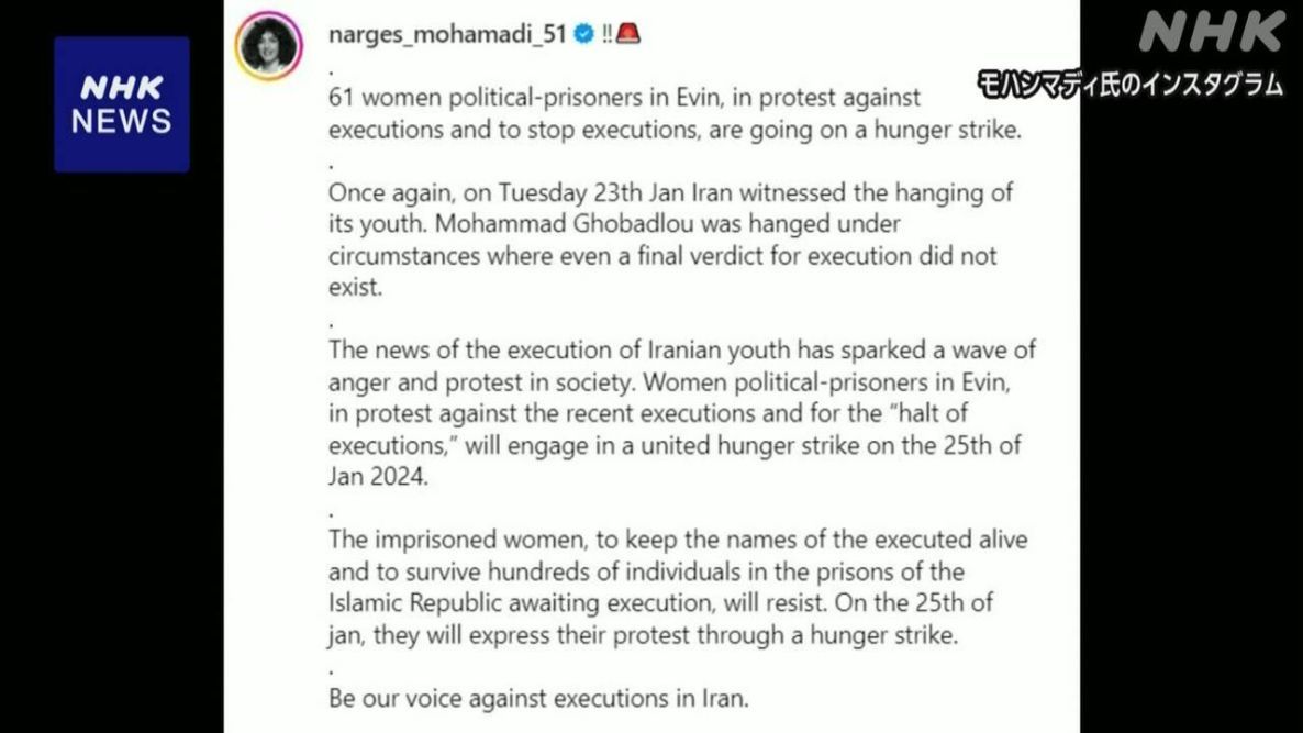 纳尔吉斯·穆罕默迪表示,将与其他61名因政治原因被关押在同一监狱的女性一同抗议,并呼吁伊朗政府停止执行接下来的死刑,以挽救在监狱中面临处决的数百人的生命。