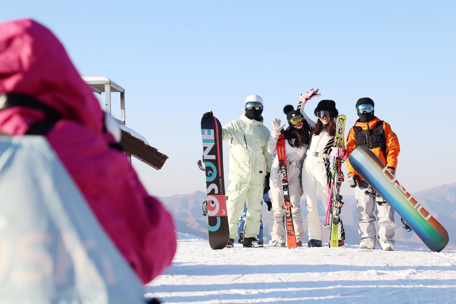 雪地“打卡”已然成为中国年轻人的雪季出游首选,也是当下流行的社交方式之一,众多年轻人在滑雪的同时也需要摄影师为他们记录下这一刻。这一需求也催生了代拍服务的摄影师,滑雪爱好者只要下载特定的软件,下载属于自己的照片。图为2024年1月29日,几名“滑友”在雪场山顶留下合影。(黎明 摄)