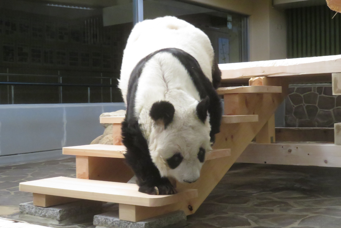 “旦旦”在爬楼梯。(图/神户市立王子动物园官方社交平台X@kobeojizoo)