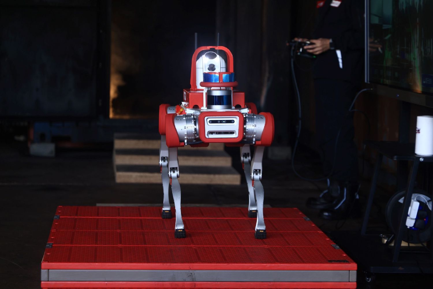 机械狗身体颜色红白相间,高不到一米,身上也装有多个中国国产仪器,可对周遭环境进行快速检测,并提供实时影像,和现场有害物质浓度的实时数据。