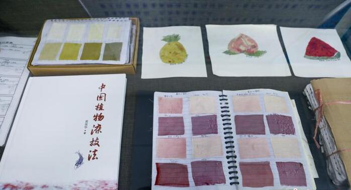 用柳叶、黄柏、栾树等植物印染的棉、麻、丝绸,被裁剪成掌心大小的方形,按不同原料、面料、色系分类,依次粘贴在笔记本上,一本厚如词典。