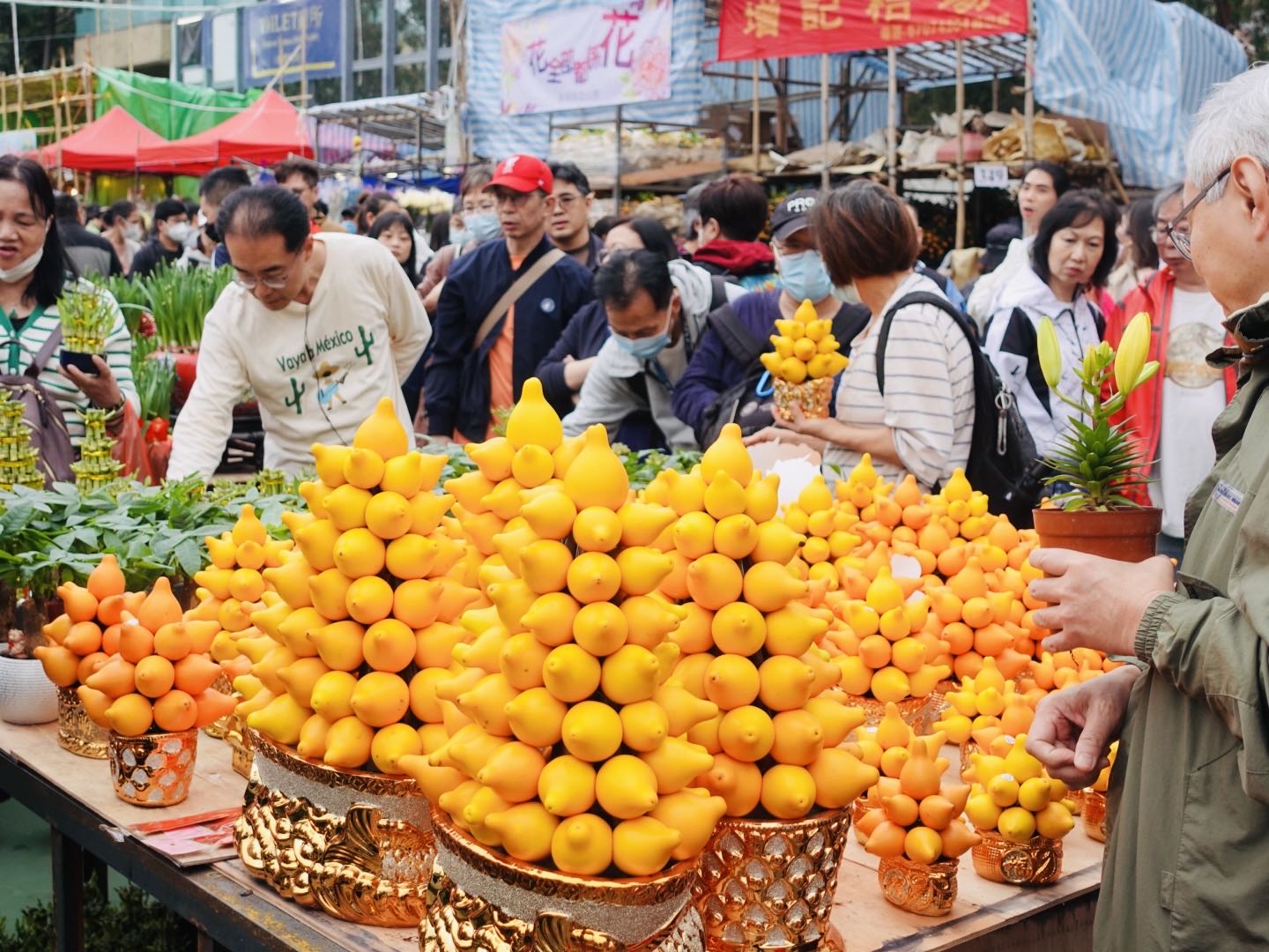 在现场,售卖花卉的摊位沿着维园天后站入口一字排开,各色鲜花竞相绽放,市民在不同的摊位上挑选心仪的年花,颜色、品种、寓意,样样都要讲究,然后心满意足地将“大展鸿桃”“大桔大利”带回家。“快过年了,买几盆金桔回家装饰下房间,今年老婆怀孕了,结果的植物寓意比较好,也是图个喜庆。”正在精心挑选花卉的市民李先生说。