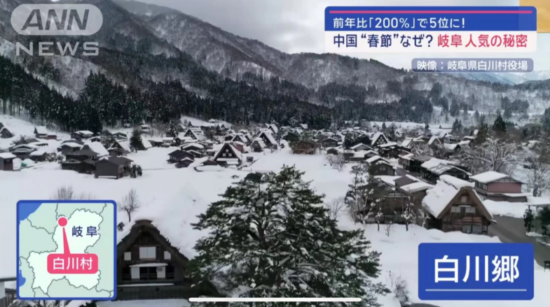 旅游网站KKday的数据显示,通过观察春节假期期间来日旅游的中国游客的预订情况,白川乡所在的岐阜县排在都道府县排行榜的第5位。前两位分别是东京、大阪,但东京、大阪的预订量与往年相比略有下降。而相对的,岐阜县今年的预定量则是前年的2倍。