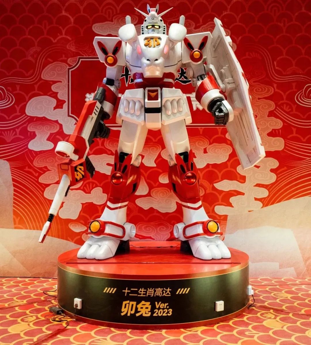 卯兔&辰龙高达插画版三米立像,作为本次展览的焦点,展示了高达机甲设计与生肖文化的创新探索。在本次展览上,不仅可以看到由大河原邦男先生设计的插画版“辰龙高达”的实物,还能一睹历代十二生肖高达系列的所有作品。(北京保利文化传播公众号)