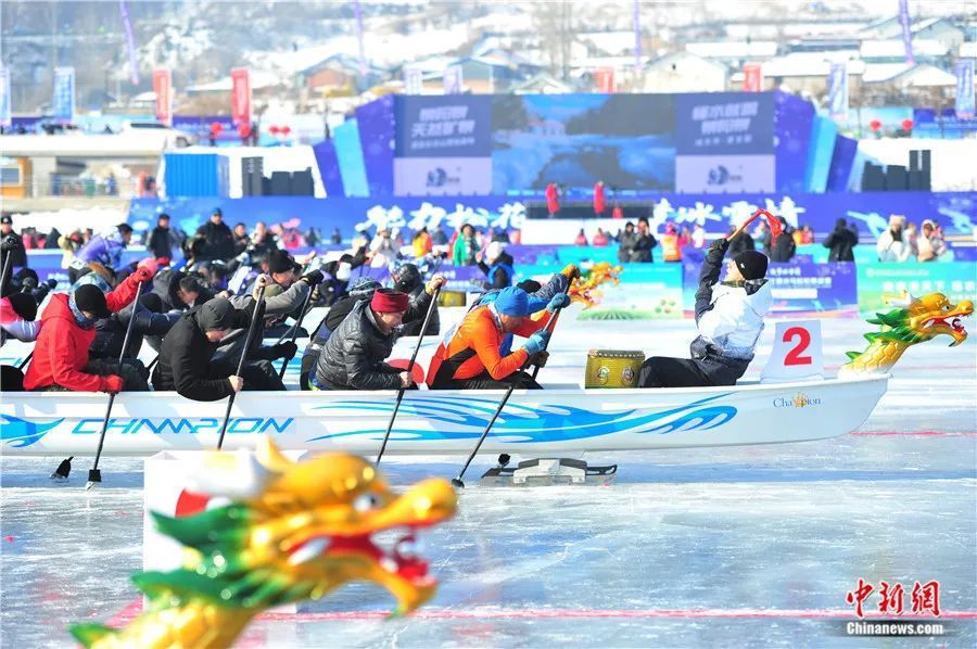 在吉林省白山市举行的首届中国·吉林松花江滑冰马拉松挑战赛上,参赛队伍进行冰上龙舟赛的比拼。高龙安摄