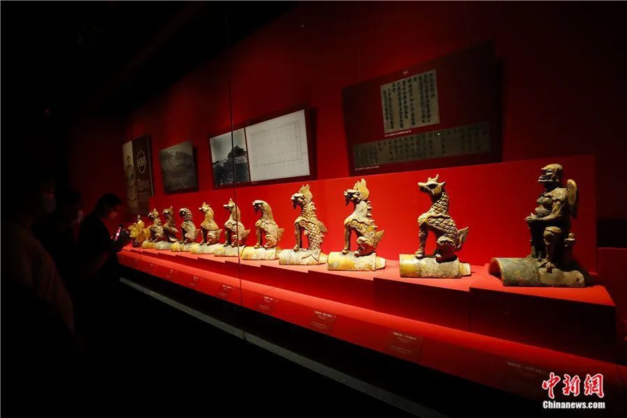 在故宫博物院午门展出的“丹宸永固——紫禁城建成六百年”展上,观众参观故宫太和殿上的脊兽,这一组脊兽是康熙三十四年(1695年)重建太和殿时的原件。杜洋摄