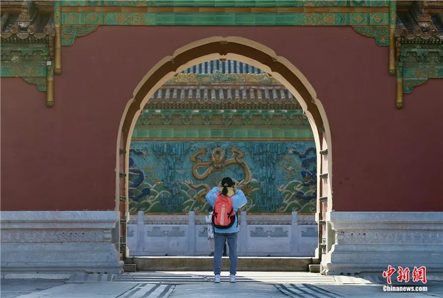 游客在北京故宫珍宝馆内拍摄九龙壁。易海菲摄