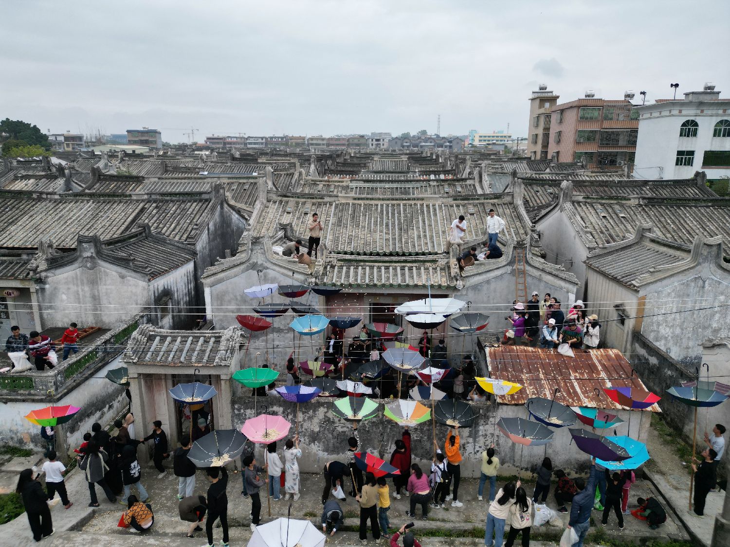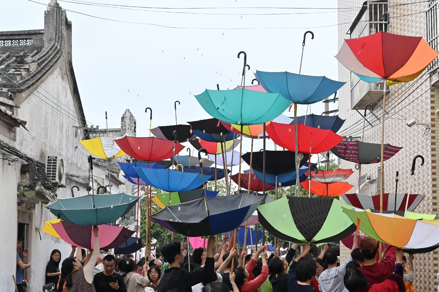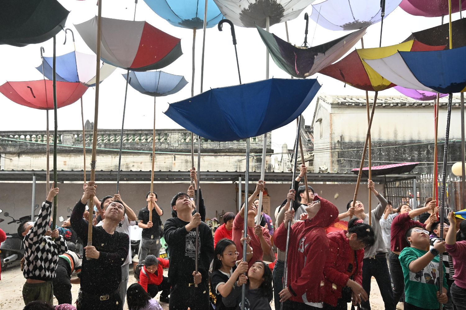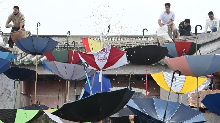 吉时一到,屋主人从怀里一袋花生抓起第一把花生,在热烈的呼喝声抛撒下去!霎时间,村民们争先用反撑的雨伞接住花生,祈愿抢到的花生越多,祝福会越多。(中新社)