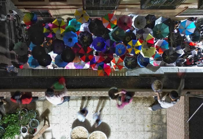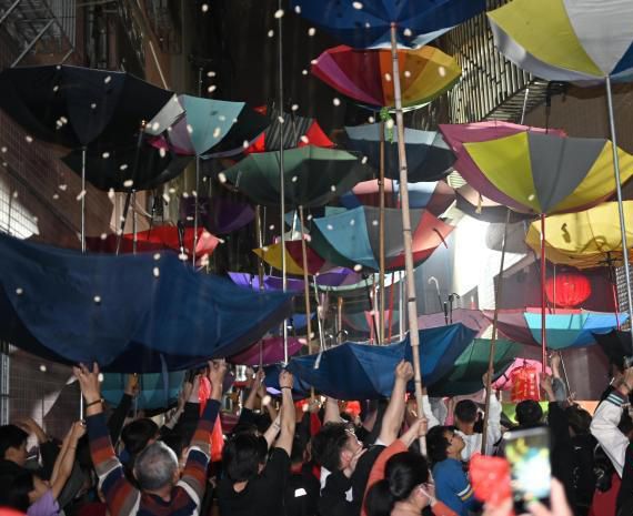 每年正月初九当天晚上,普宁市大坝镇平林村村民们早早就来到去年第一个生下男孩的村民家外面,举起手中反转的雨伞等待。(中新社)