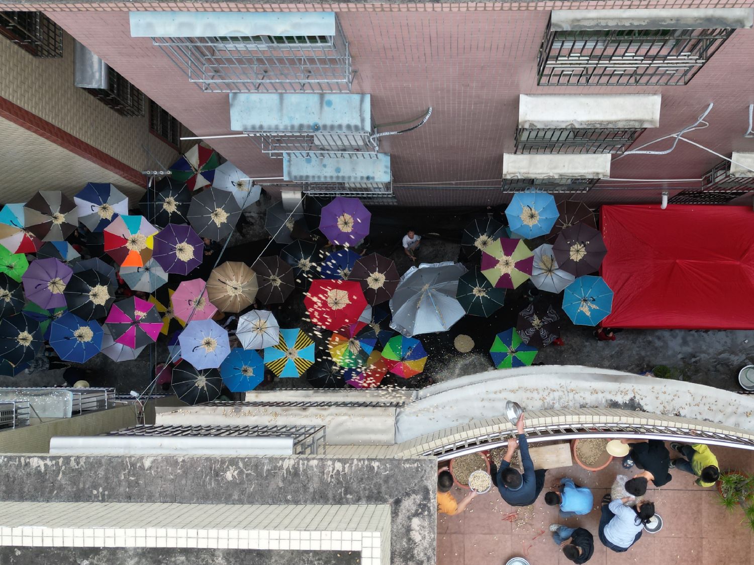 2月18日至19日,广东揭阳普宁大坝平林村村民“撒花生”送祝福,吸引周边民众前来抢花生“接福”。据悉,花生,在潮汕话里与“会生”谐音。从正月初九晚到正月初十早上,平林村前一年新添男丁的家庭会在屋顶撒落大量花生,将喜悦与他人分享。在楼下接花生的民众将雨伞打开、翻转、高举,变成“接花生”神器,得花生多者意味着沾到更多喜气、接到更多祝福。(中新社)