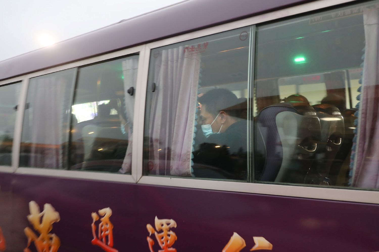 图为当地时间20日傍晚,渔船事件中的一位遇难者女婿何代波随团乘车离开金门县殡葬管理所。(图/中新社)