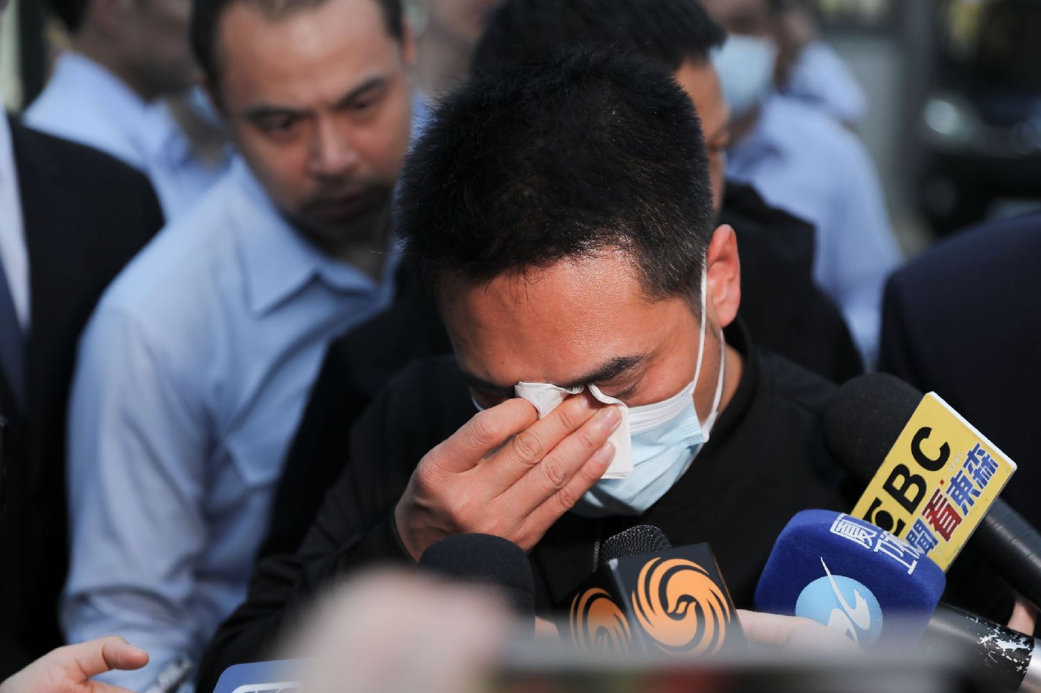 图为当地时间20日傍晚,渔船事件的其中一位遇难者女婿何代波接受采访时情绪激动。(图/中新社)