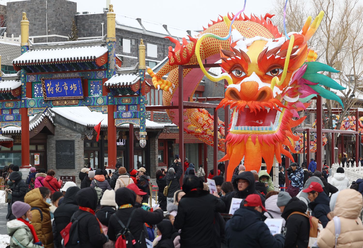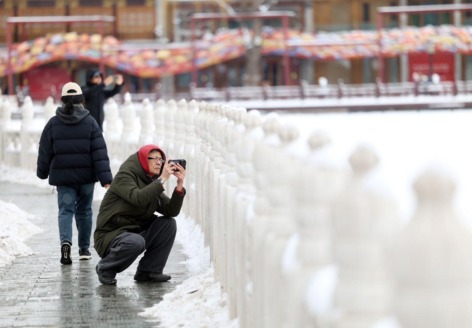 2024年2月21日,游客在北京什刹海欣赏落雪后的“巨龙”景观。 20日,北京迎来龙年第一场雪,初雪后的北京到处银装素裹,景色如画。北京各处景观因降雪吸引了大批游客,人们用相机捕捉初雪后的北京。(黎明 摄)