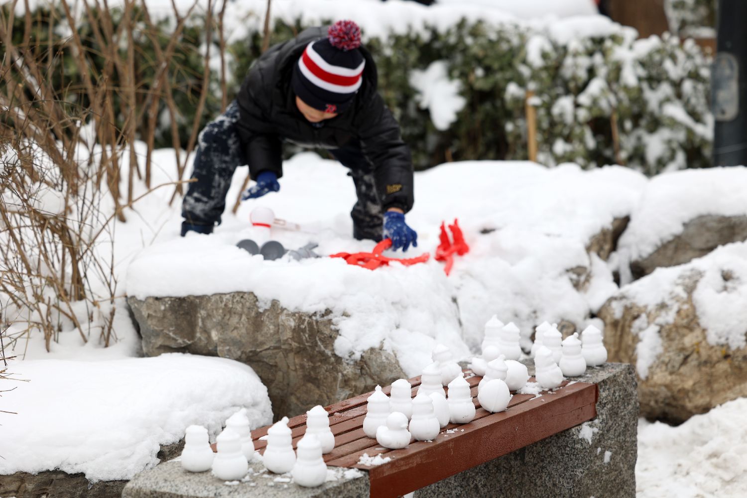 2024年2月21日,一名小游客正在堆雪人。(黎明 摄)