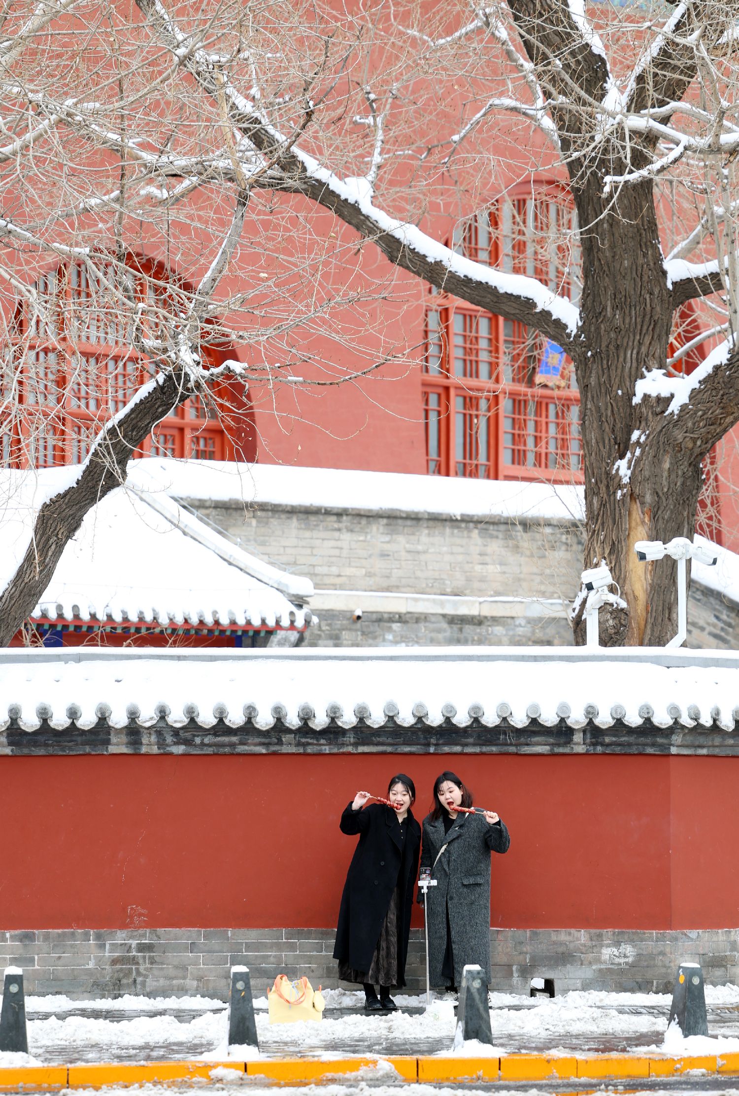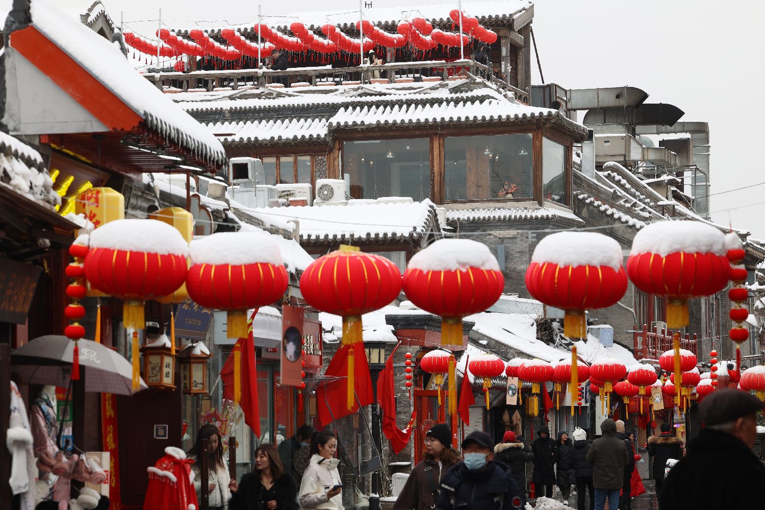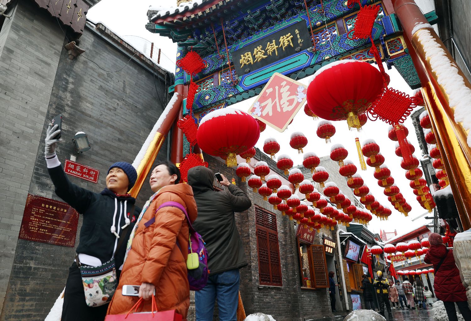 2024年2月21日,北京烟袋斜街的雪景吸引游客拍摄。(黎明 摄)
