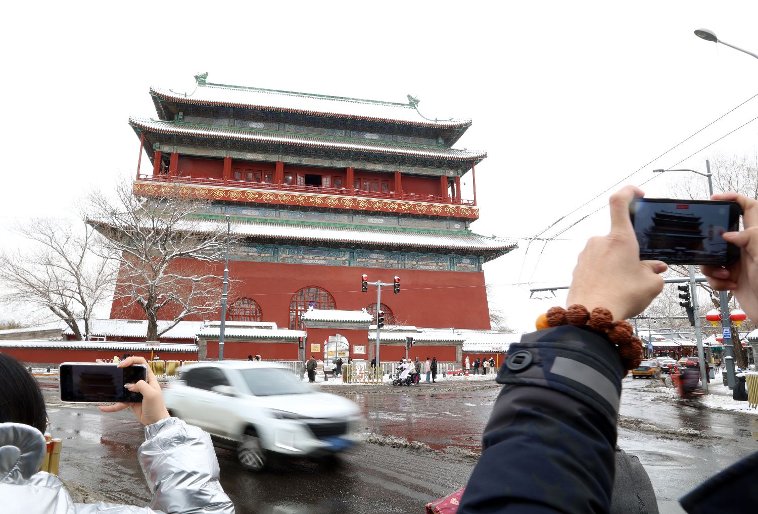 2024年2月21日,被白雪覆盖的北京鼓楼吸引游人拍摄。(黎明 摄)