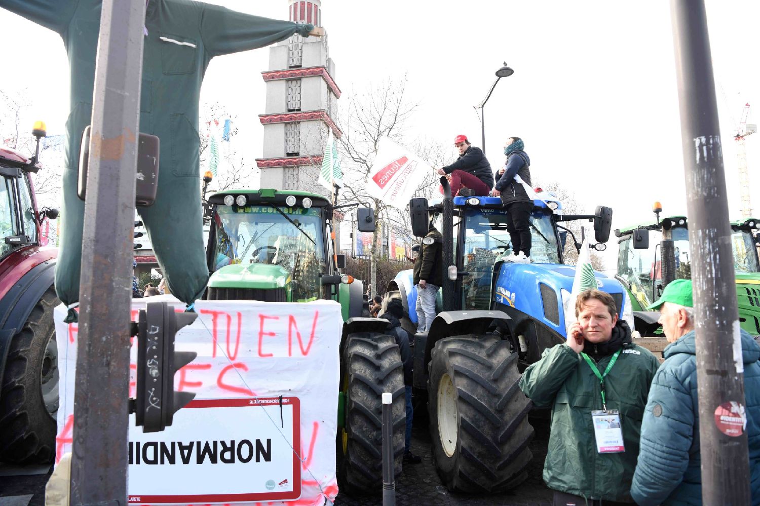 图为示威农民将拖拉机停放在农博会举办地巴黎凡尔赛门会展中心入口处。(图/中新社)