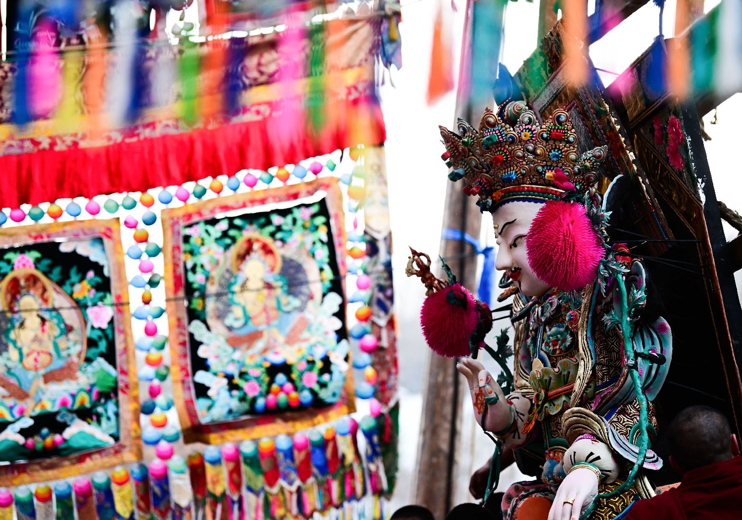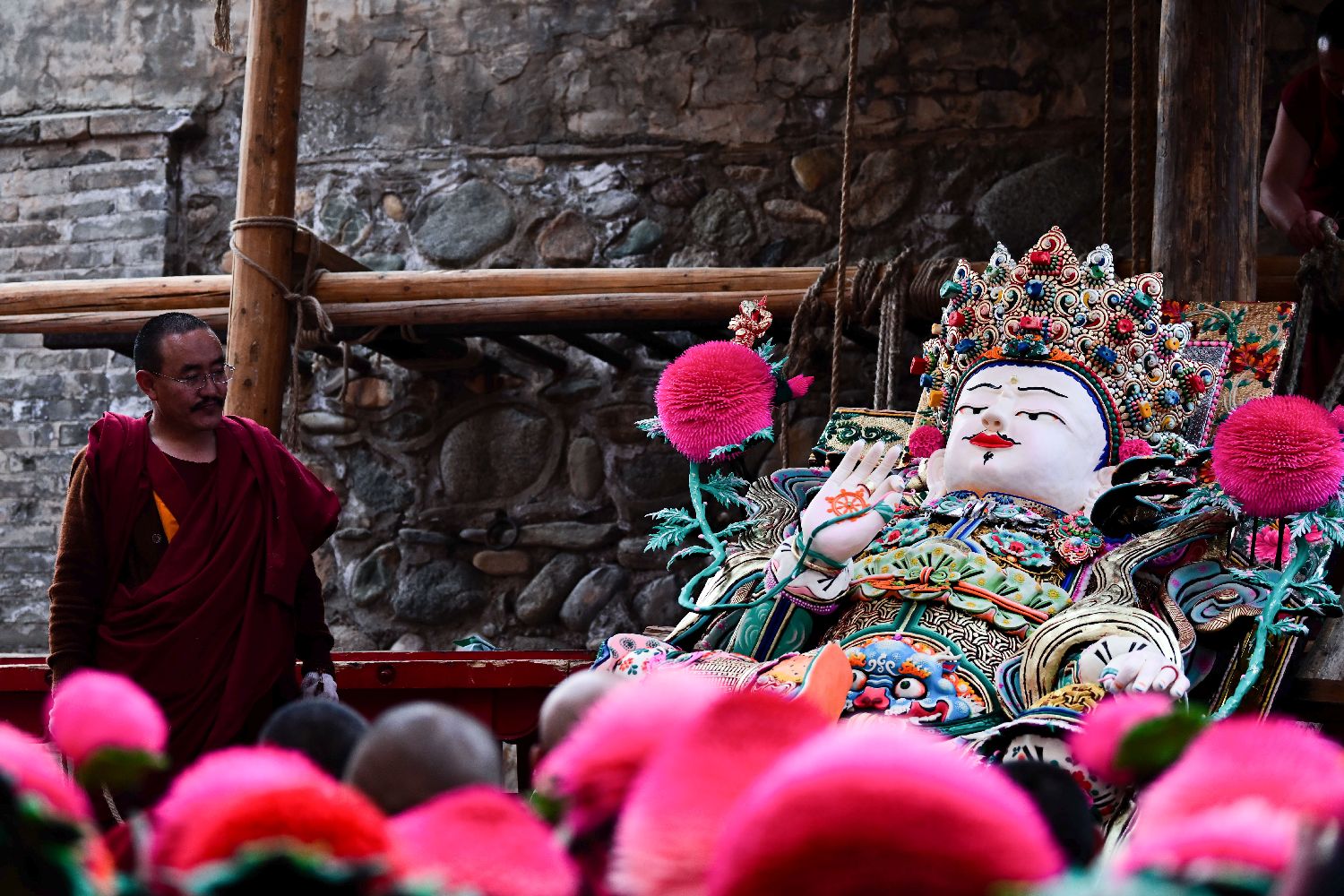 僧人们将制作好的酥油花搬上展台。(新华社)