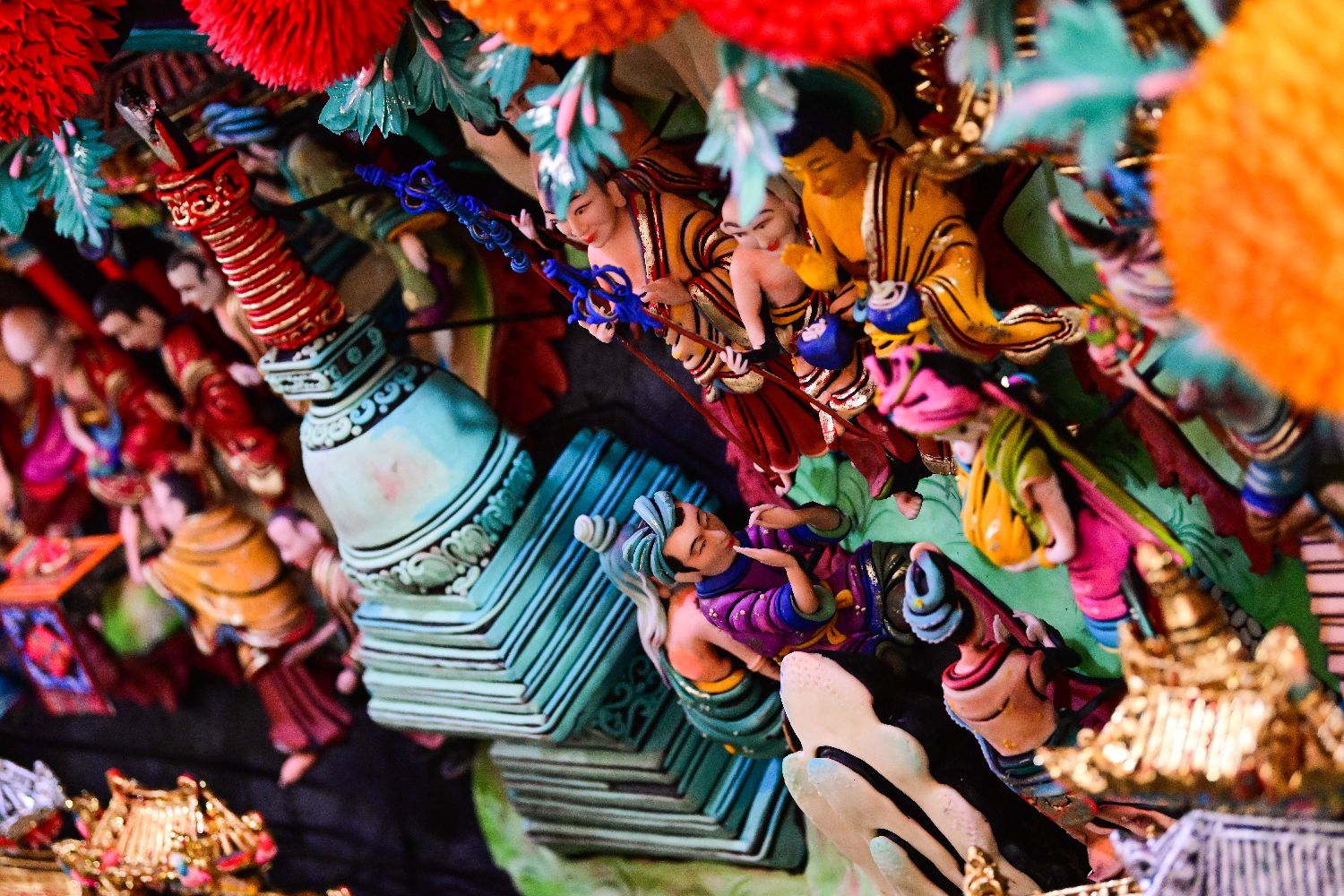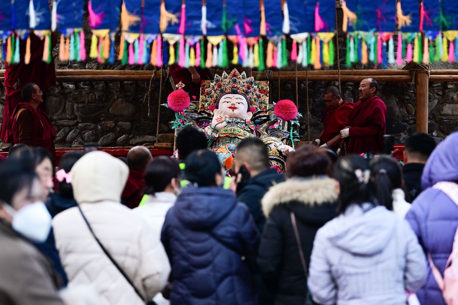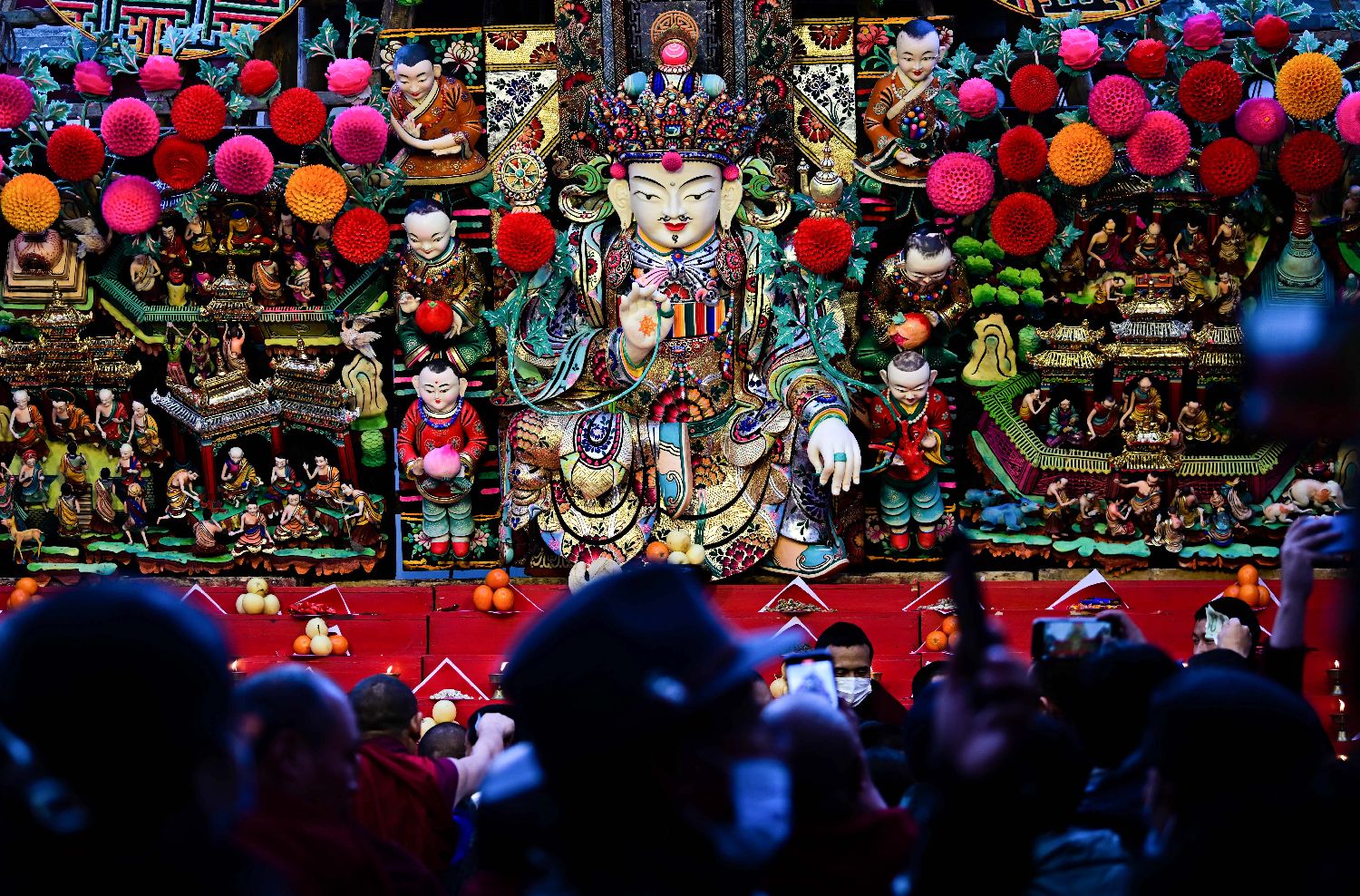 图为僧人们将制作好的酥油花搬上展台。位于青海省西宁市湟中区境内的藏传佛教名寺塔尔寺2月24日举行酥油花展,吸引众多游客前来参观。酥油花是塔尔寺“艺术三绝”之一,由寺院艺僧以酥油为原料精雕细捏而成,以神像、人物、飞禽走兽、花草树木等为主要内容,形象逼真、色彩丰富,具有很高的艺术水平和独特的艺术魅力。(新华社)