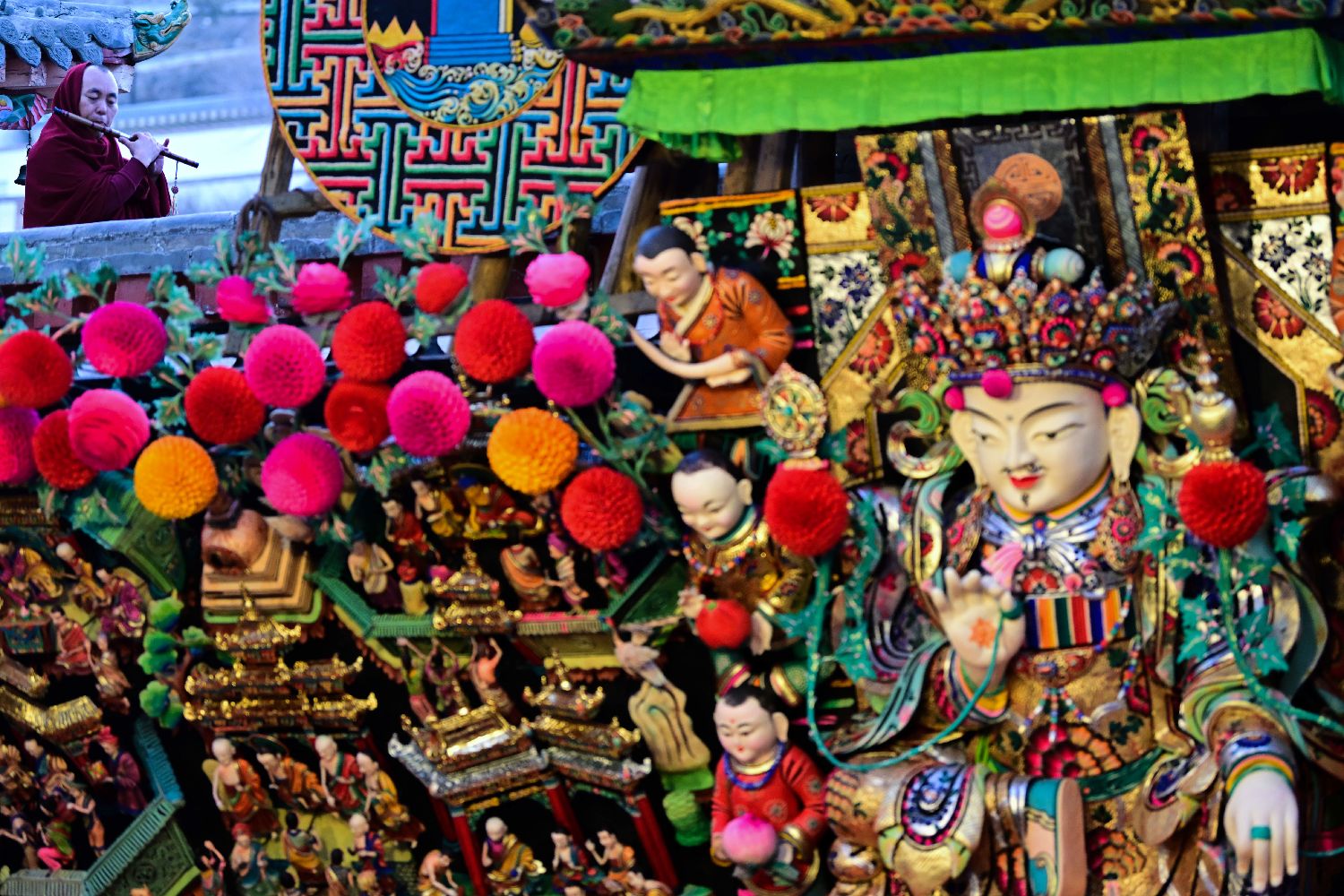 一位艺僧在酥油花展上吹奏法乐。(新华社)