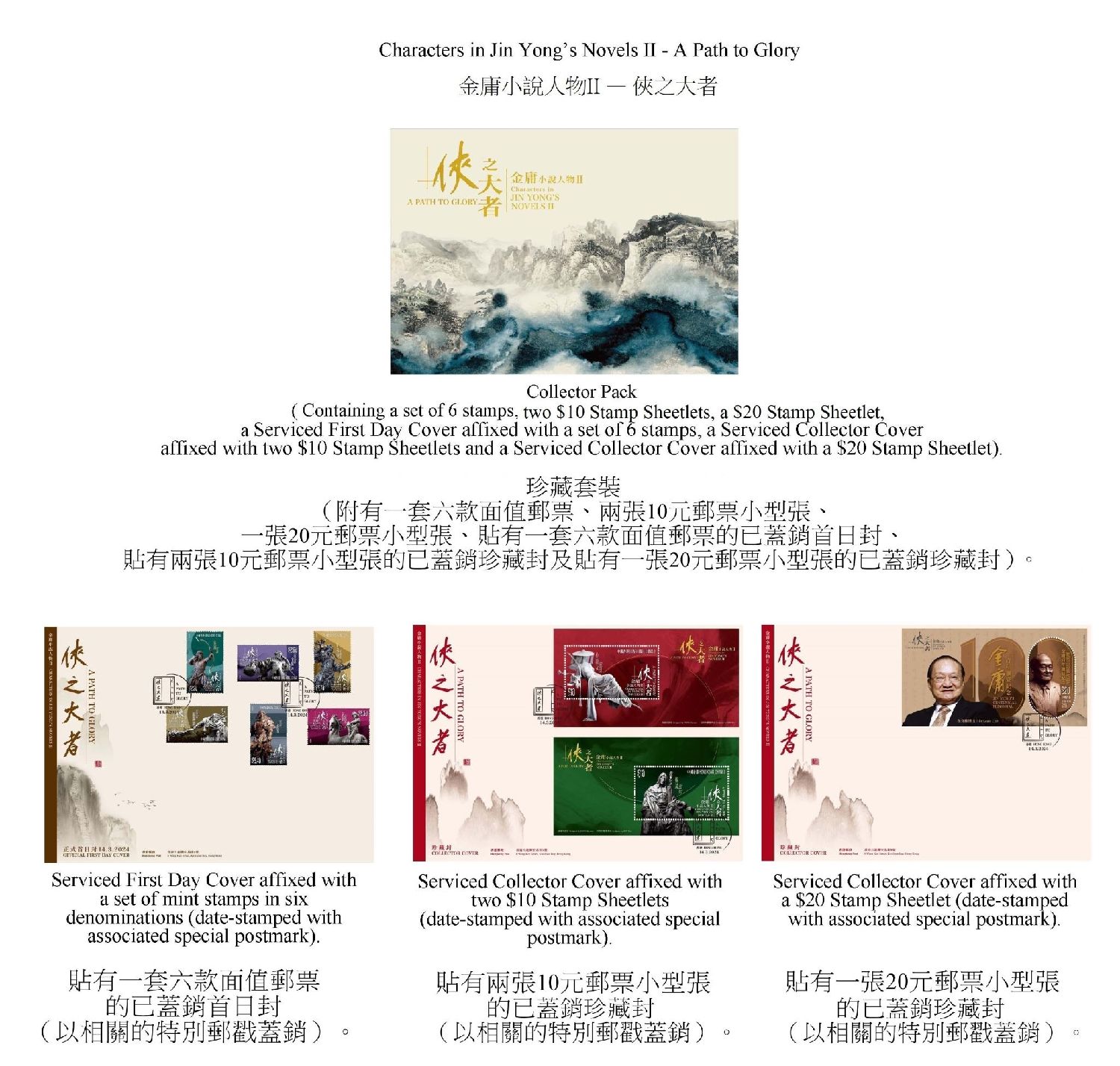 2024年为金庸诞辰百年,香港邮政2月29日宣布,将于3月14日推出发售一套以“金庸小说人物II──侠之大者”为题的特别邮票及相关邮品。