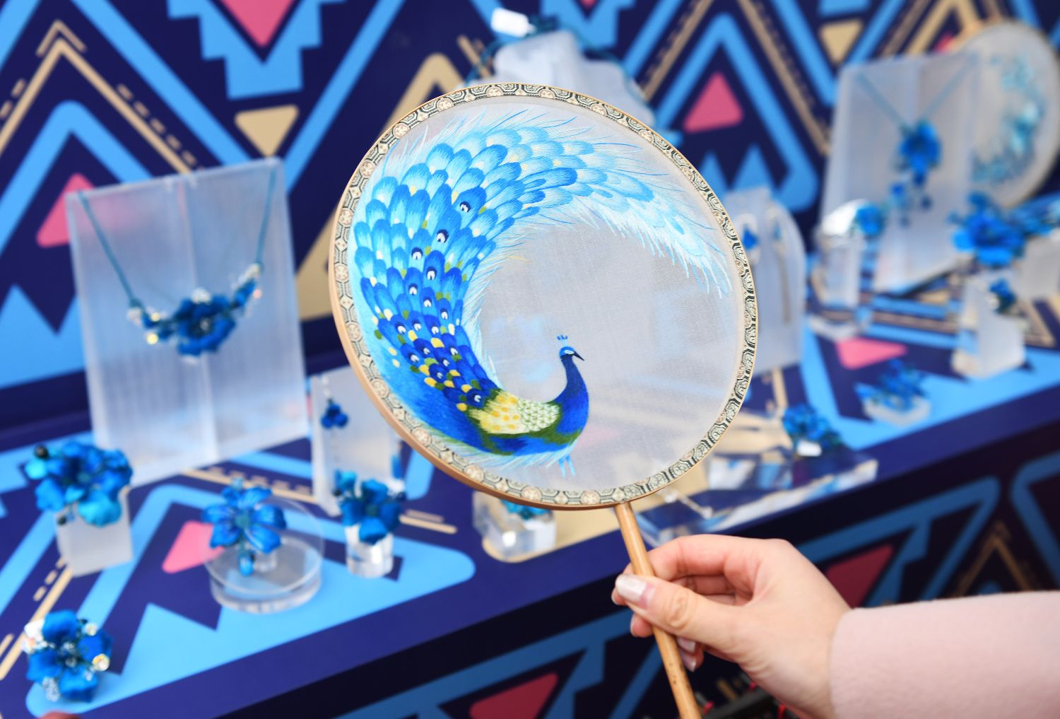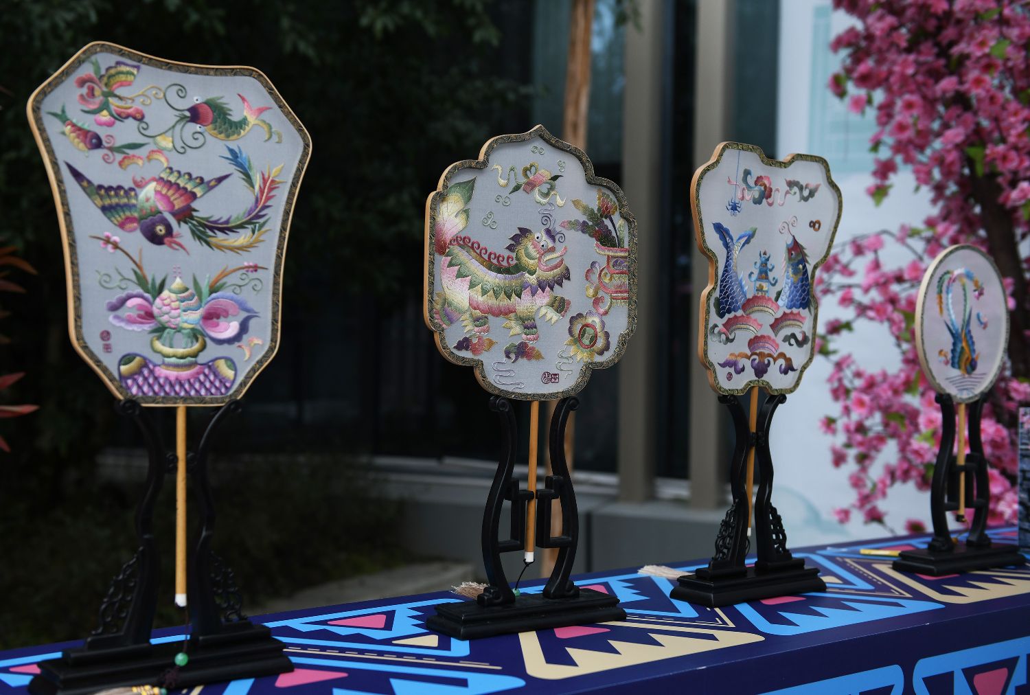 2月29日,重庆酉阳举办非遗文创展,酉州苗绣制作的扇子亮相。(中新社)