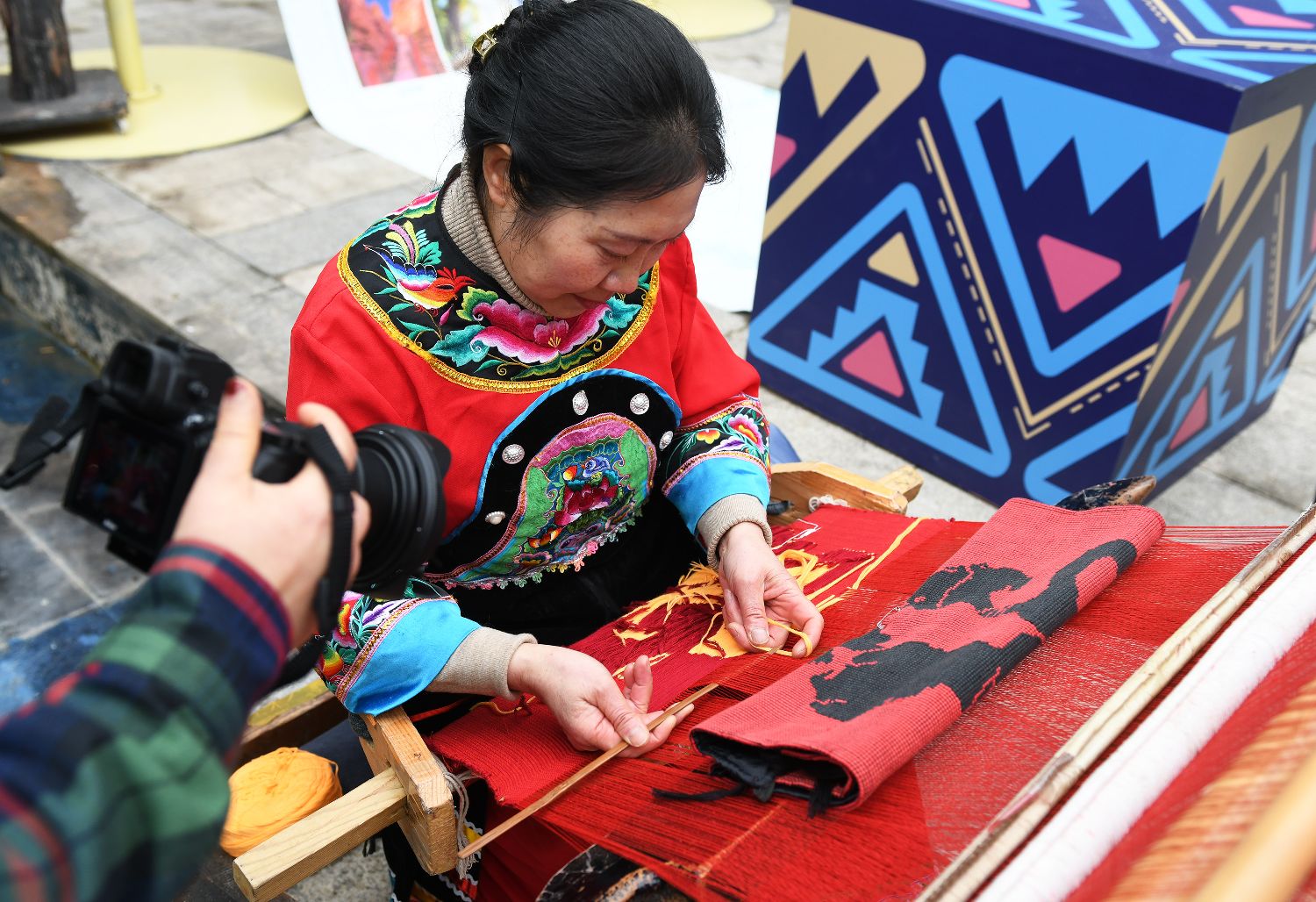 2月29日,重庆酉阳举办非遗文创展,绣娘展示被纳入国家级非物质文化遗产名录的西兰卡普织造工艺。(中新社)