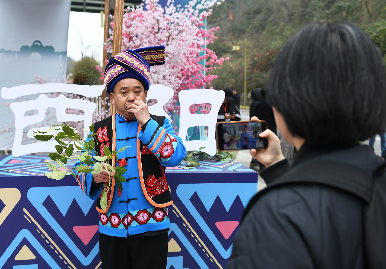 2月29日,重庆酉阳举办非遗文创展,酉阳木叶吹奏非物质文化遗产传承人白现贵现场表演《木叶情歌》。酉阳木叶吹奏2011年被纳入重庆市市级非物质文化遗产名录。(中新社)