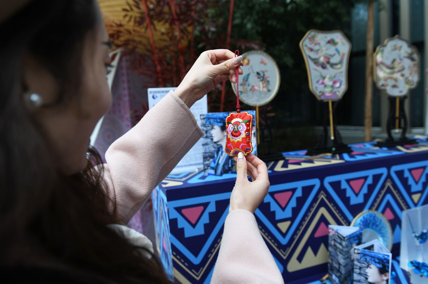 2月29日,重庆酉阳举办非遗文创展,重庆市非物质文化遗产酉州苗绣制作的香包吸引参观者。(中新社)