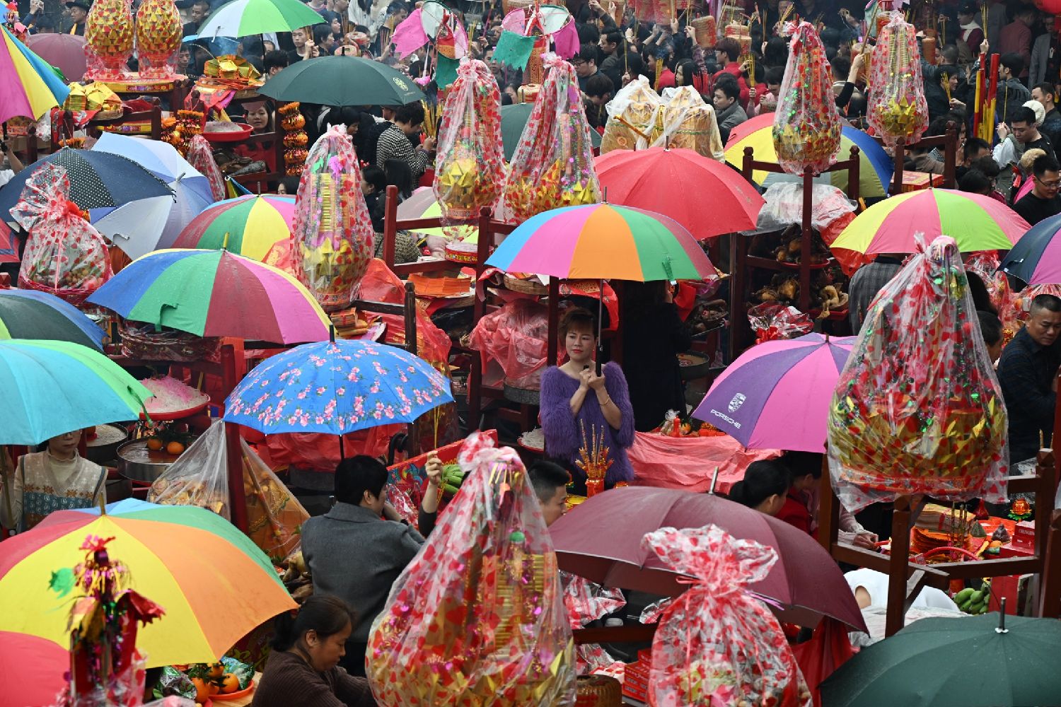 3月5日,农历正月廿五,广东省揭阳市砲台镇石牌村举行“摆粿架”民俗活动,现场挂着红灯笼和彩旗,广场上摆着数百个粿架。村民在粿架上摆放着甜粿、卤鹅、水果等,以祈求新年风调雨顺、五谷丰登。图为村民为粿架撑彩伞遮雨。(中新社)