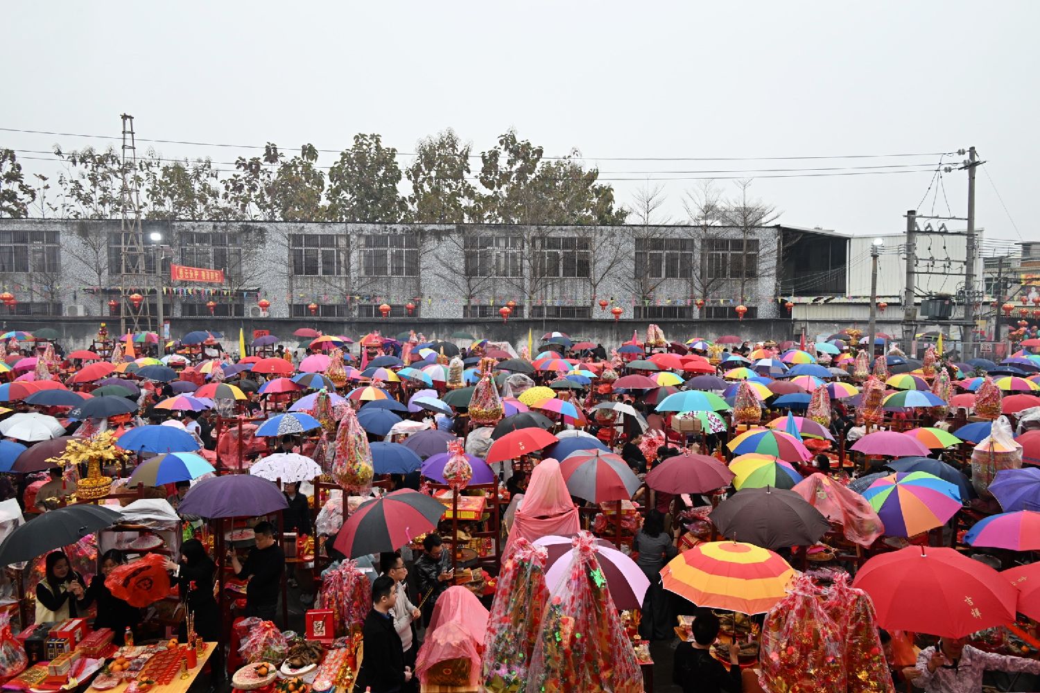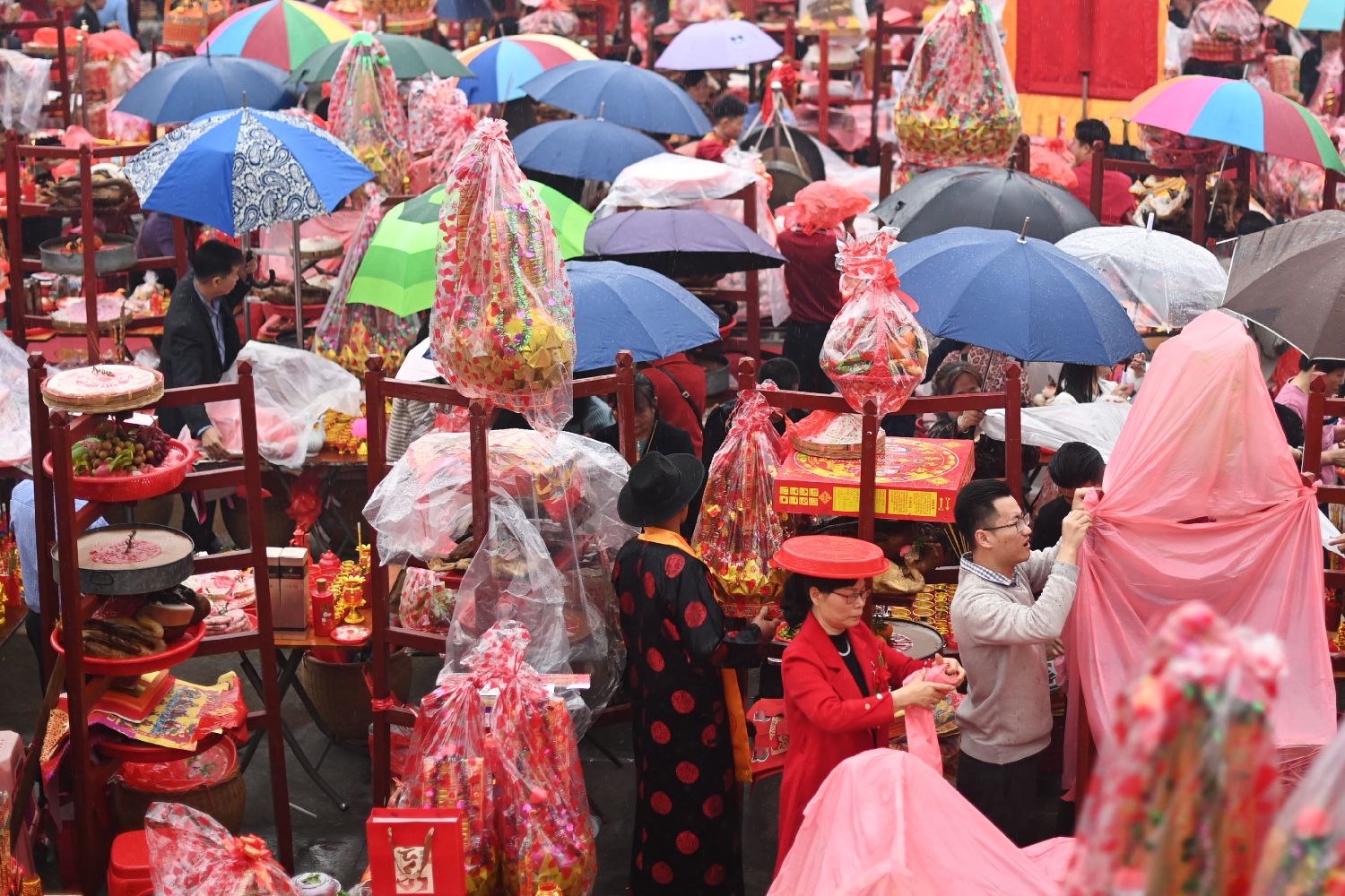 3月5日,村民为粿架撑彩伞遮雨。(中新社)