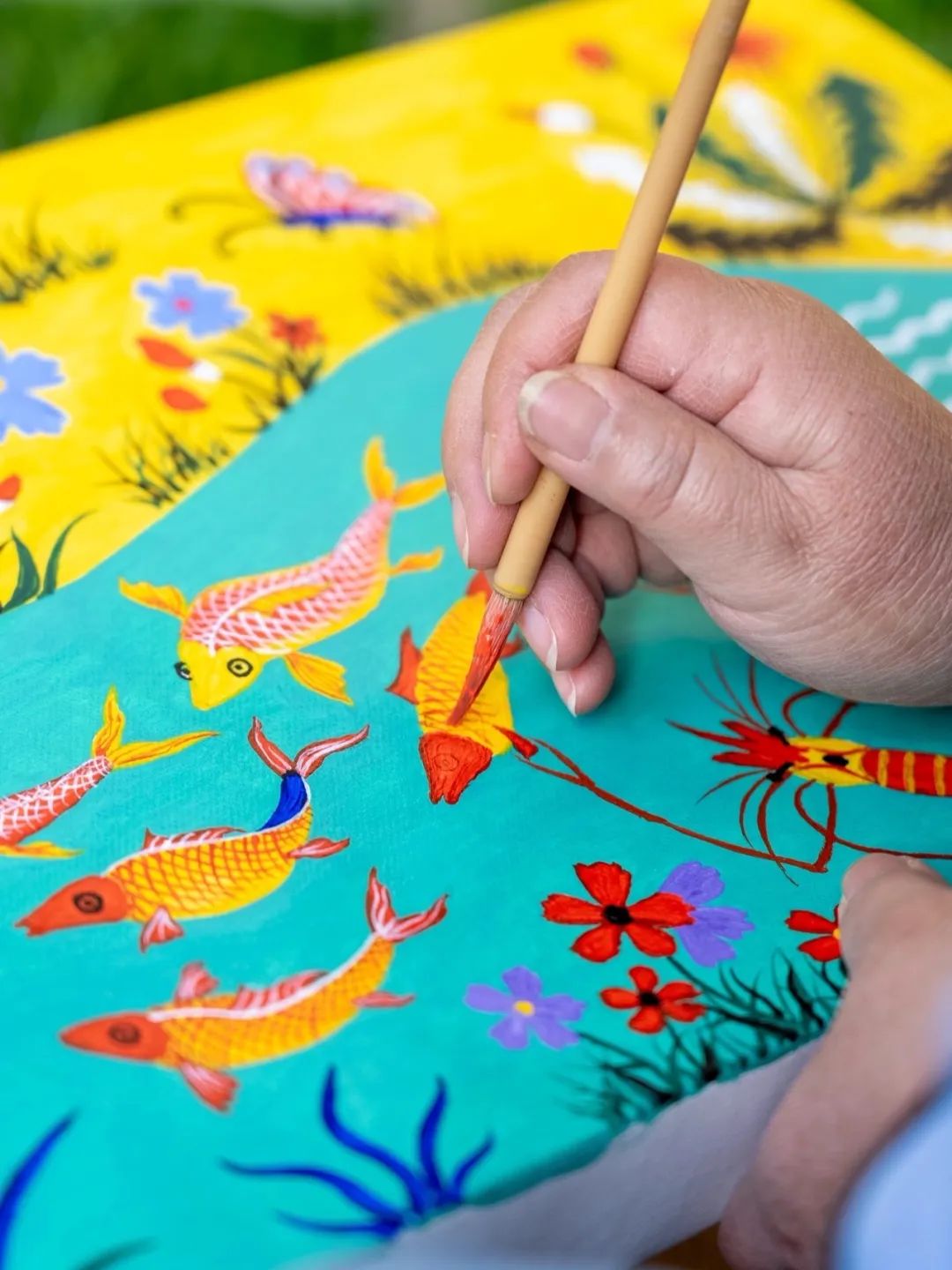 画中九条自由自在的金线鲃,除了代表着她对故乡的美好记忆,同时也寓意着长久的吉祥如意与年年有余。而那些短暂盛开的波斯菊,则是提醒人们要珍惜每一个美好的瞬间。图为罗丽珍手拿星巴克展示作品《捞鱼河春日风光》。(星巴克中国官方微博)