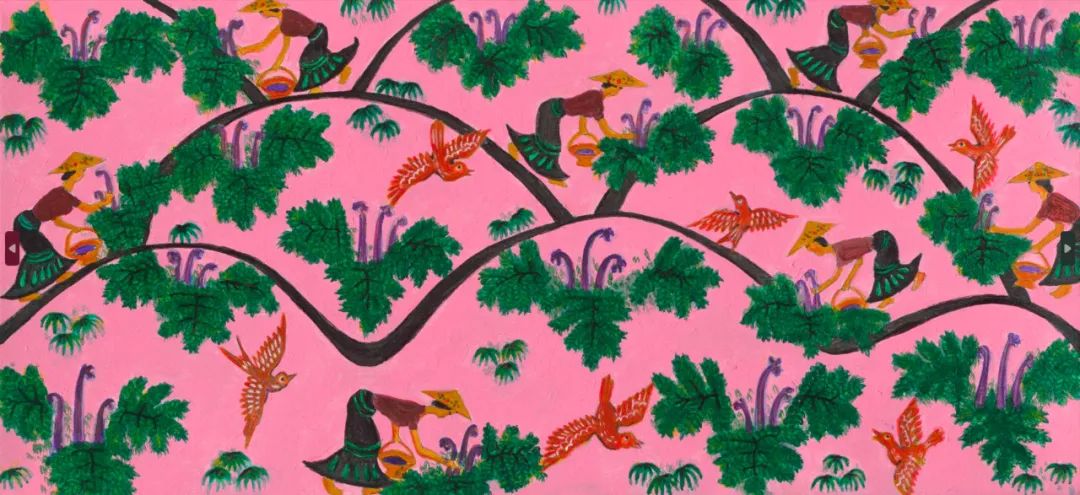第四幅作品则由来自腾冲滇滩镇的傈僳族画家熊亮蔡,以其独特的视角和传统色彩的运用,描绘了一个充满生机与希望的场景。(星巴克中国官方微博)