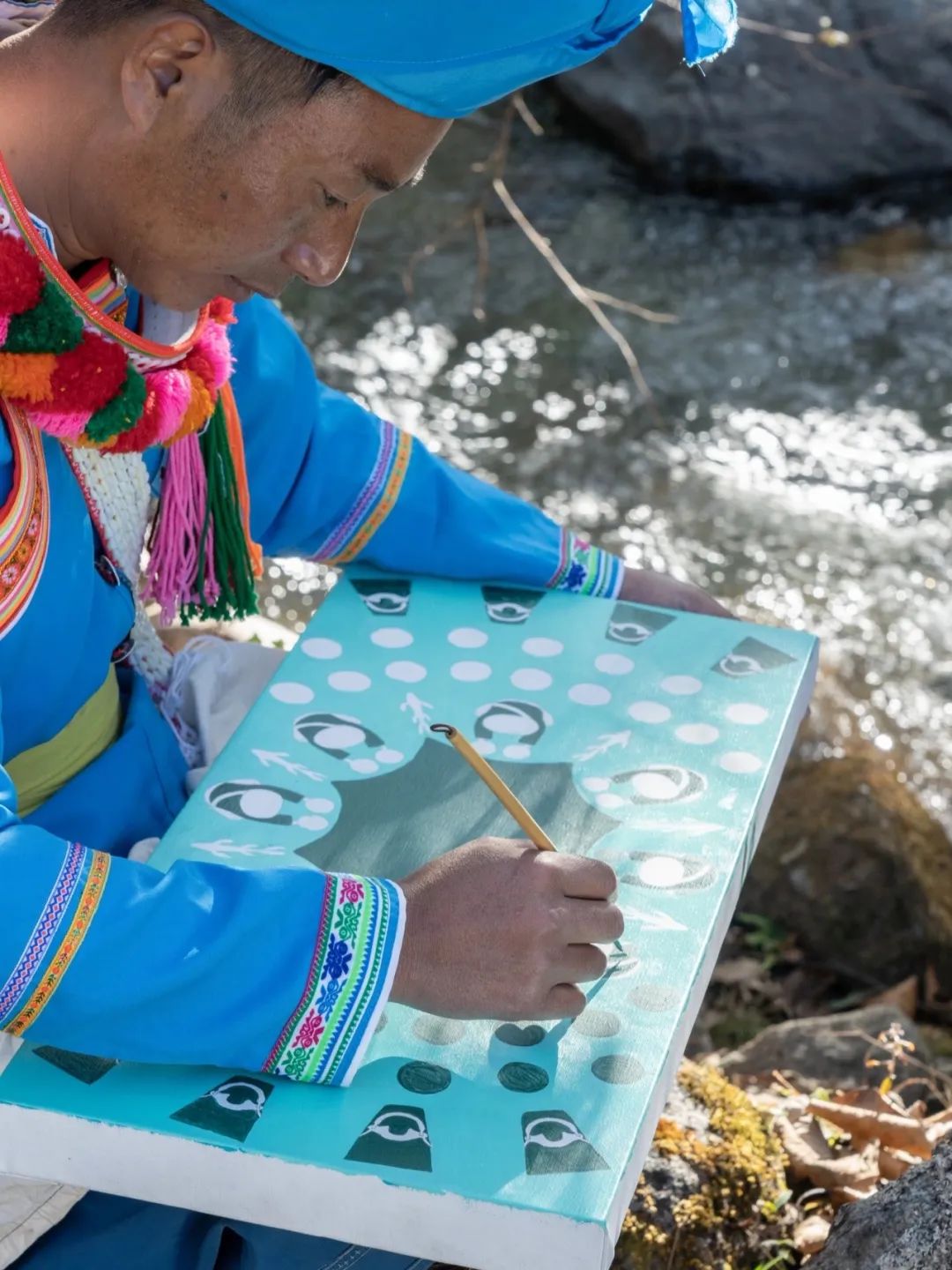 熊亮蔡的画作不仅仅是对美的追求,更是对傈僳族传统的一种致敬。在《傈僳族拔秧苗图》中,他以傈僳族传统的蓝色为主色调,这种色彩在傈僳族文化中具有特别的意义,象征着天空与水,是生命与自然的颜色。(星巴克中国官方微博)