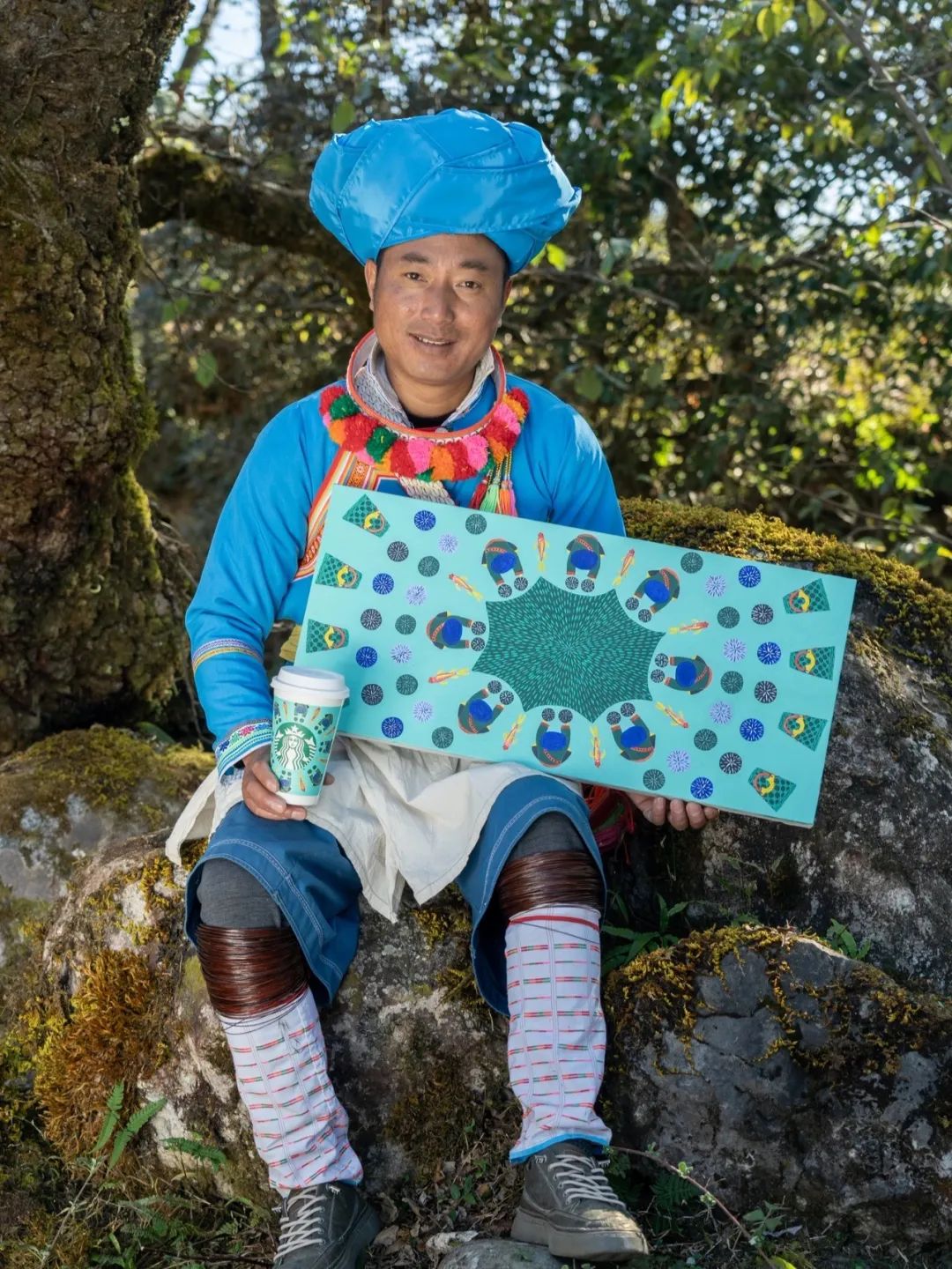 图为星巴克与四位云南农民画家“联名”的咖啡。(星巴克中国官方微博)