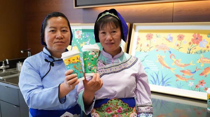 图为农民画家展示她们被印在星巴克咖啡纸杯上的画作。(图/中新网)