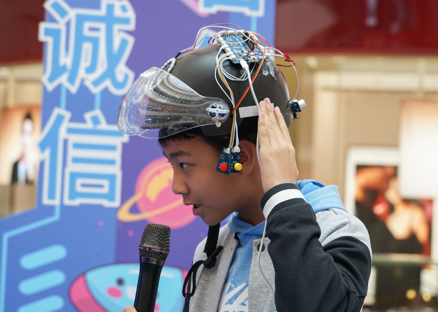 图为学生演示自己的科技创新作品“智能头盔”。(中新社)