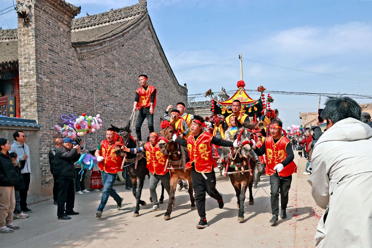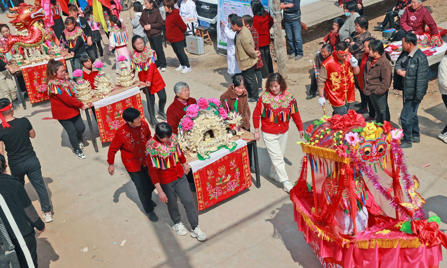 3月9日,“中国传统村落”陕西大荔县羌白镇阿寿村热闹非凡,花苫鼓开道,跑骡车护驾,各种造型气势恢宏的上百组花馍从四社八堡涌向村子中央的药王庙,“赛花馍”赛出了村民振兴乡村的精气神,吸引来省内外上万游客慕名一睹风采。阿寿村享有“中国民间艺术之乡“的美誉,二月二庙会面花艺术历史悠久,起源于汉唐,普及于明清,流传于现代,以其独特的制作技艺、渊源的历史背景、栩栩如生的造型享誉中华。图为村民抬着花馍走向村子中央的药王庙。(中新社)