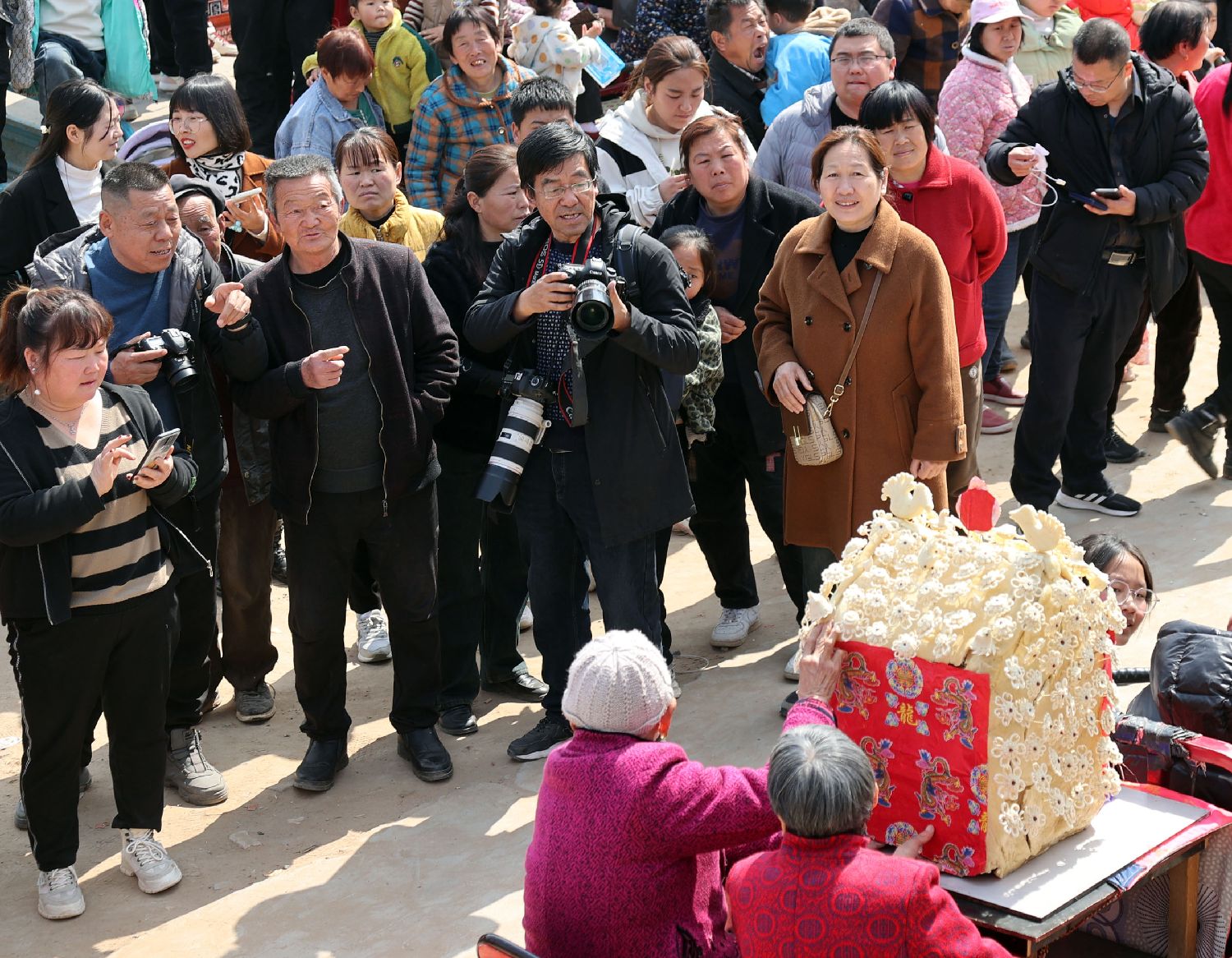 3月9日,“中国传统村落”陕西大荔县羌白镇阿寿村热闹非凡,花苫鼓开道,跑骡车护驾,各种造型气势恢宏的上百组花馍从四社八堡涌向村子中央的药王庙,“赛花馍”赛出了村民振兴乡村的精气神,吸引来省内外上万游客慕名一睹风采。