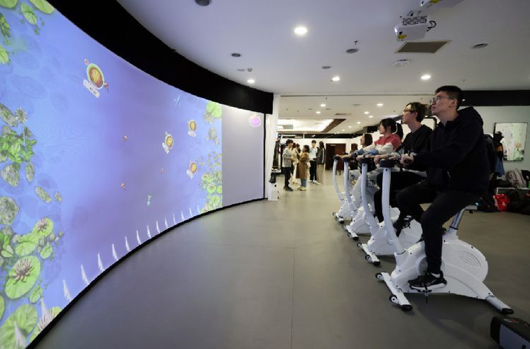 学生体验智能单车。该设备使用磁阻设计,自发电及动态自动变阻,独创智慧化功能,搭载各类实景及虚拟赛道,与趣味运动游戏相交互。(北京《新京报》)