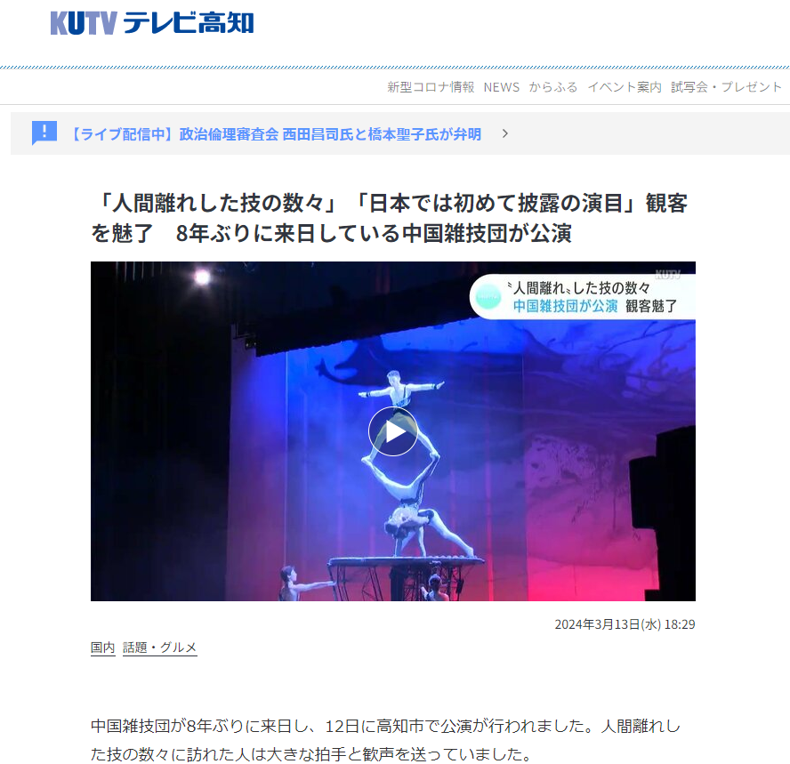 高知电视台报道,中国杂技团“MIRACLE☆ZATSUGI”在高知县民文化剧场进行了演出。正在日本各地巡回演出的“MIRACLE☆ZATSUGI”,当天吸引了约1200名观众前来观看。