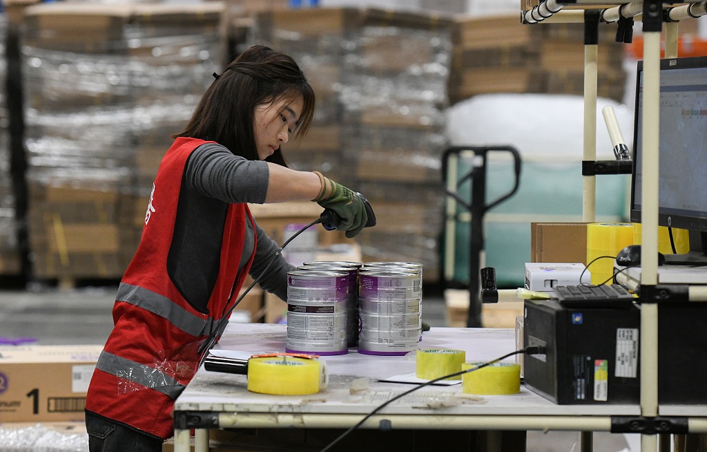 中国员工在仓储中心打包跨境电商货物。(视觉中国)